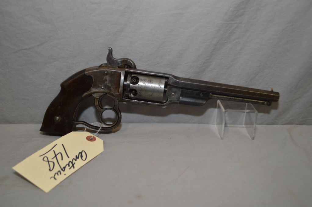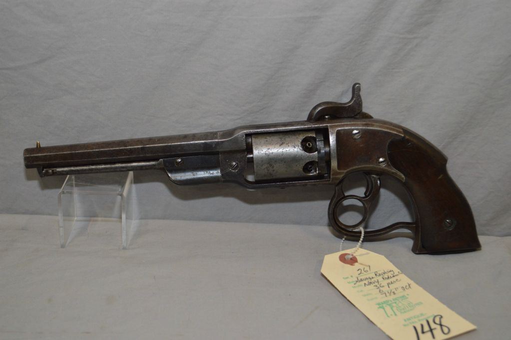 Savage Revolving Firearms Co. Model Navy .36 Perc Cal 6 Shot Revolver w/ 7 1/8" octagon bbl [ fading blue finish turning brown with some light pitting, chipped and worn walnut grips, hinge type loading lever assembly, flat side frame, heart - shaped trigger / lever guard, two triggers ( one is a ring trigger which cocks and turns cylinder, and other one fires ), top of frame marked "Savage R.F.A. Co. Middletown. CT H.S.North Patented June 17, 1856, January 10, 1859, May 15, 1860" , barrel stamped with H, frame stamped with W, also loading lever guide stamped with W, Prod Quantity Approx. 20,000, Circa 1861 - Mid 1860's Civil War Era ] Ser # 261 ANTIQUE NO PAL REQ