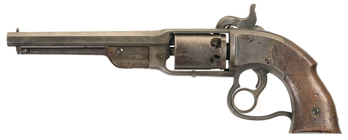 Manufactured between 1861 and 1865 with standard markings and features. Faint illegible cartouche on left grip panel. "H" on left barrel flat at breech and "W" on the frame.