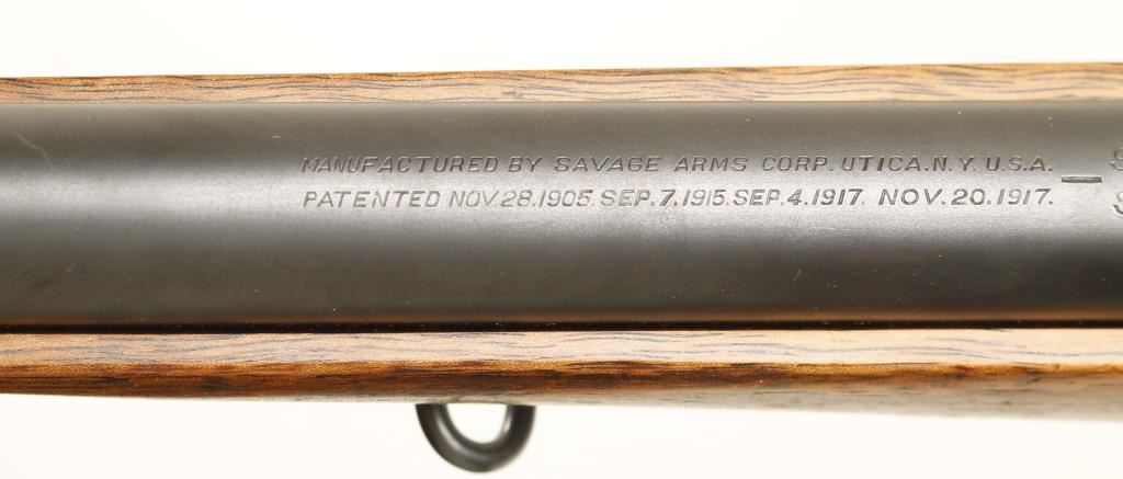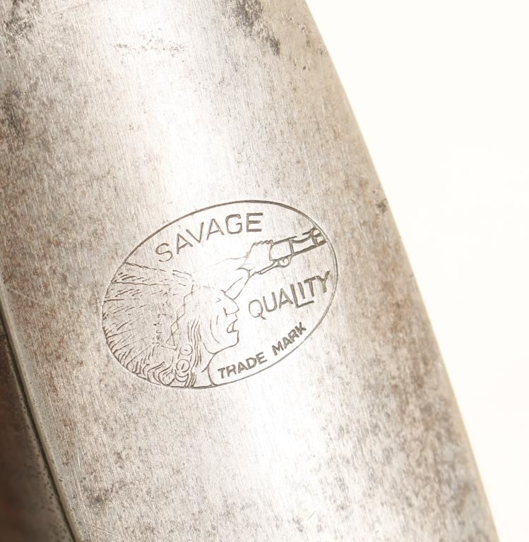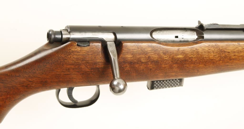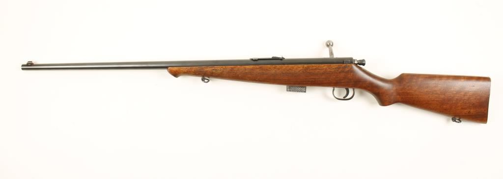 Blued bolt-action box magazine fed rifle with a 24-1/2" barrel and one magazine. Bluing is good with light edge wear and a few rubs. Factory butt plate with "Screaming Indian" is almost bare metal with general wear marks and rust stains. Wood is in very good condition with very few marks. Bore is bright and shiny. Action works well. Condition is excellent. *Modern Firearm*
