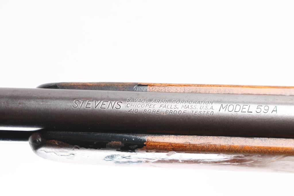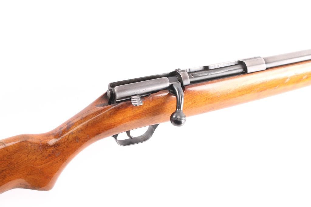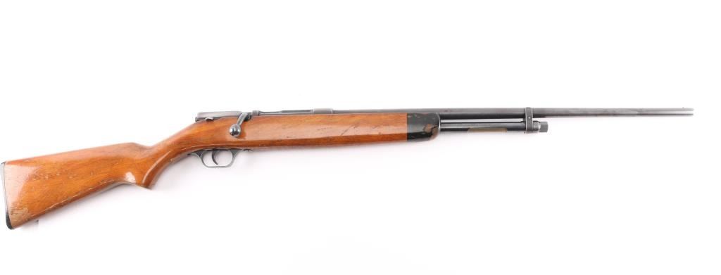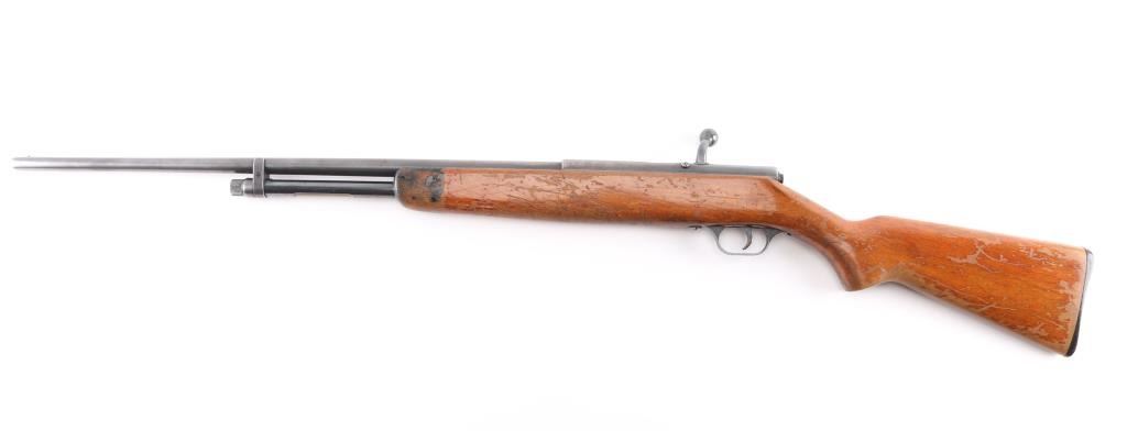 Vintage tube fed bolt action shotgun chambered for 2 1/2" & 3" .410 gauge shells. Features a blued finish, 24" barrel, steel bead front sight, 1/2 length tube magazine, turned-down bolt handle, cocked indicator of the rear of the bolt, manual safety on the right side of the receiver, smooth trigger, alloy triggerguard and smooth walnut pistol grip shoulder stock with serrated black buttplate. Bore is very good condition, measures as Full choke. Retains 50% blue with fading and thinning, barrel drifting towards brown color, receiver is thinning towards silver color. Triggerguard shows much gray base metal color. Stock is good condition with finish losses, loss of black painted forend color. Bolt can rotate when pulled to rear, must be lined up for the bolt handle to fit the slot.