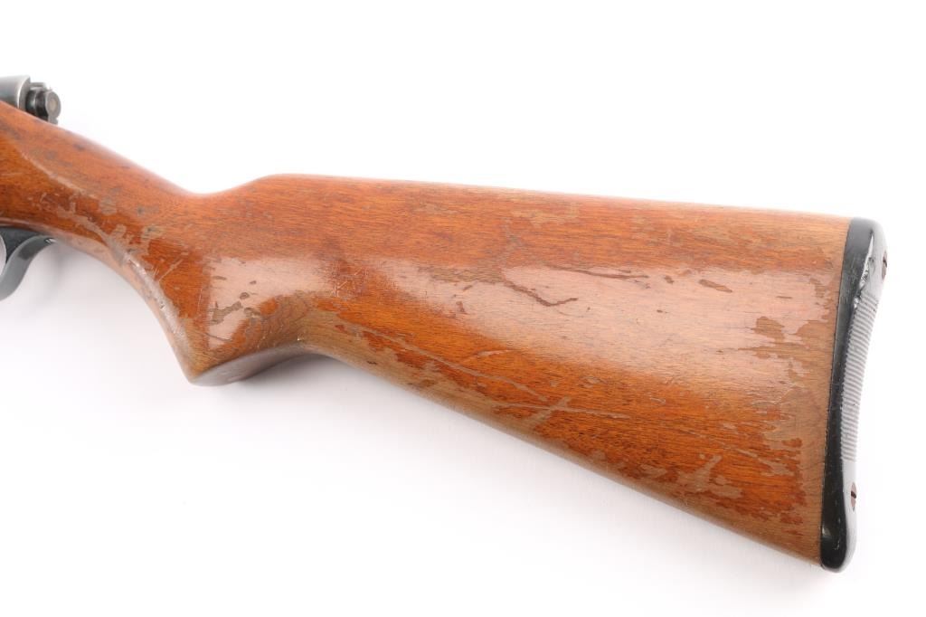 GOOD: Some minor replacement parts; metal smoothly rusted or lightly pitted in places, cleaned or re-blued; principal letters, numerals and design on metal legible; wood refinished, scratched bruised or minor cracks repaired; in good working order.