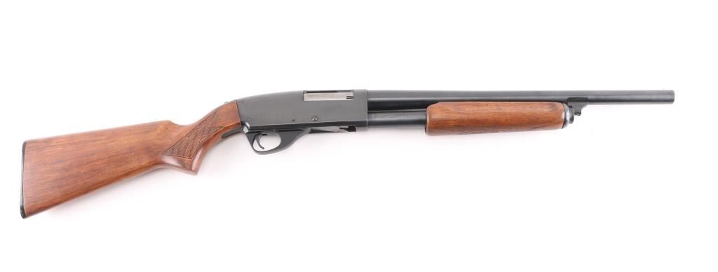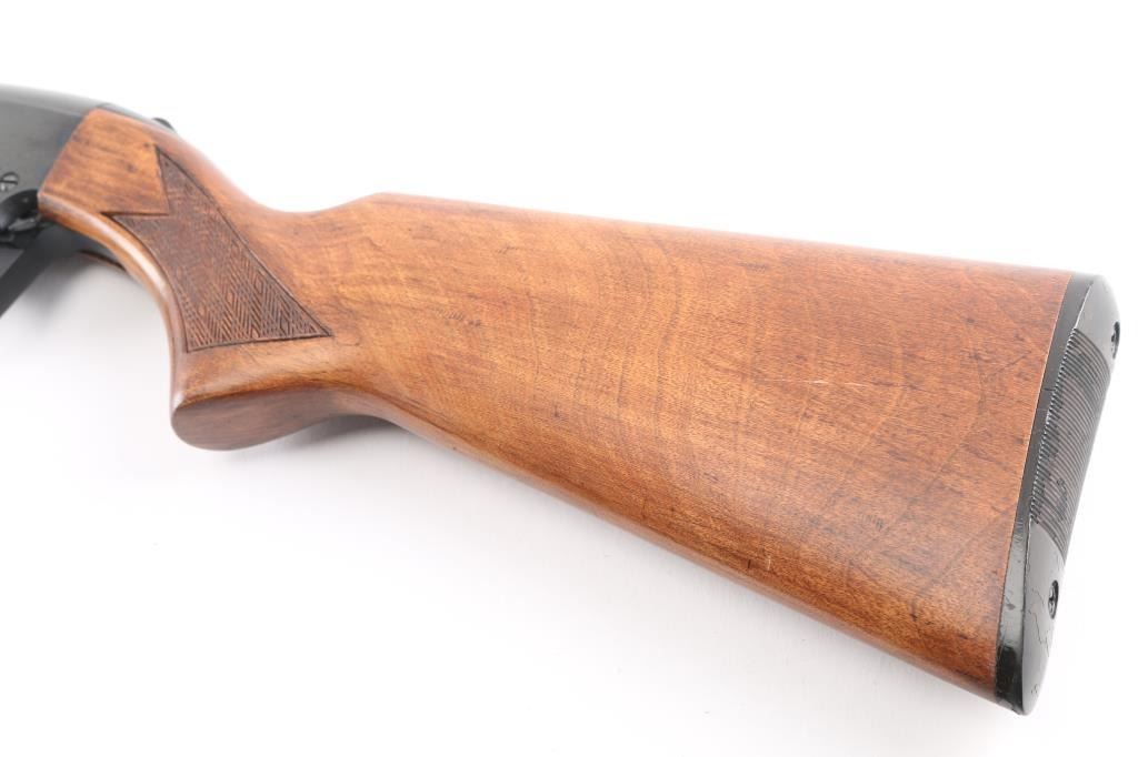 'E Series'. Tube fed slide action shotgun chambered for 2 3/4" & 3" 12 gauge shells. Features a blued finish, 18.5" barrel,bead front sight, IC choke, 3/4-length tube magazine, smooth trigger, tang safety, wood slide handle and pistol grip shoulder stock with basket weave grip panels, serrated black plastic buttplate. Slide release on left receiver. Shotgun exhibits approximately 98% of it's original blued finish showing light friction wear on the tube. Action is smooth, the bore appears excellent/bright, and the wood stocks are near excellent. Produced 1972-89.