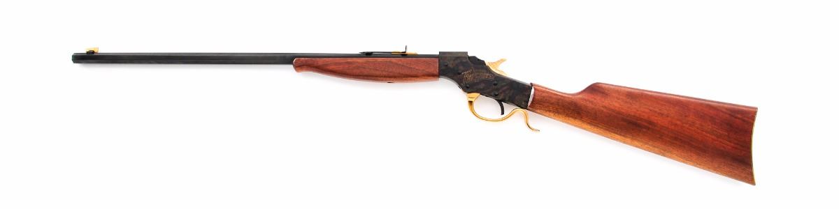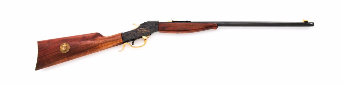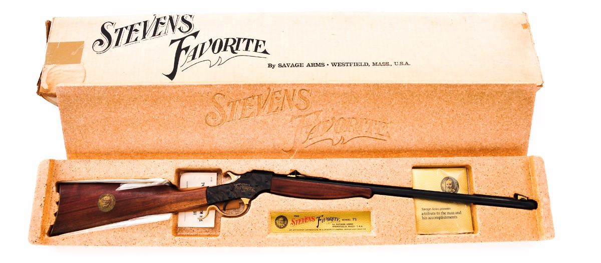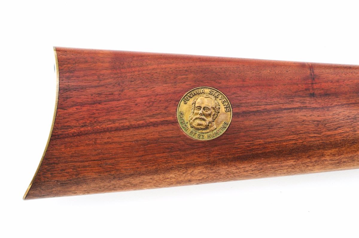 Savage/Stevens ''Joshua Stevens'' Commemorative Model 71 Single Shot Rifle, #13177SF, .22 S-L-LR cal., 22'' octagon blue barrel, case hardened receiver that reads ''Steven's Favorite'' in gold lettering to both sides; straight walnut stock and forend, right side of buttstock with inlaid ''Joshua Stevens, Father of .22 Hunting'' medallion, standard sights, gold-plated hammer, lever, buttplate, front sight blade and rear sight elevator. In original box with matching end label, owner's manual, original hang tag, and parts diagram. Condition is excellent, appearing as new, with the exception of losses to the gold plating on hammer, otherwise with only light marks from handling. Est.: $300-$450. (Modern)