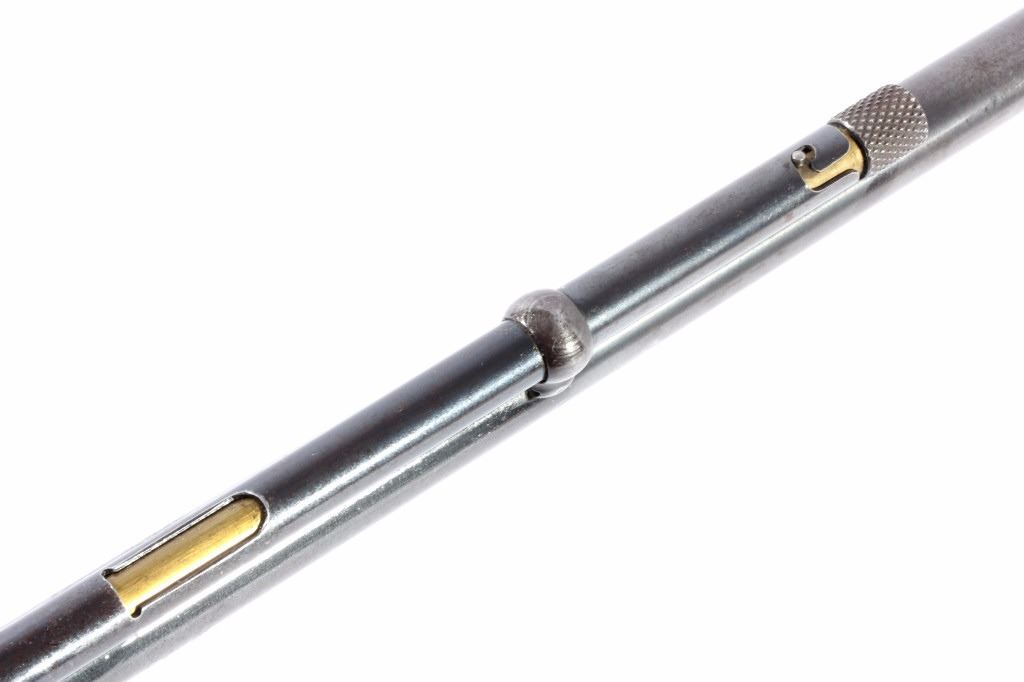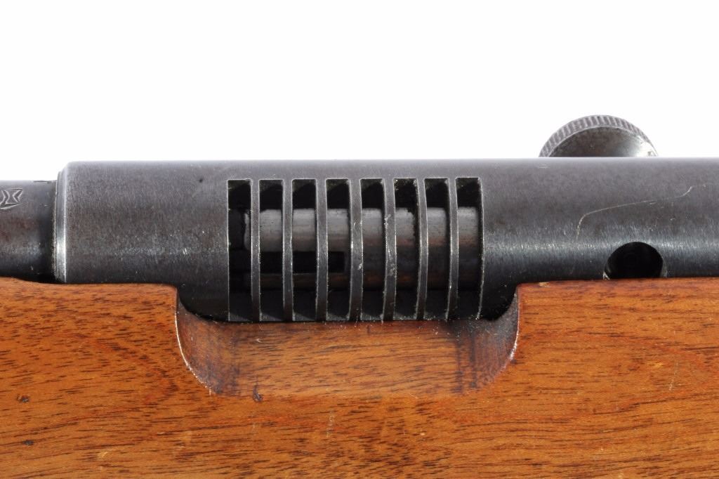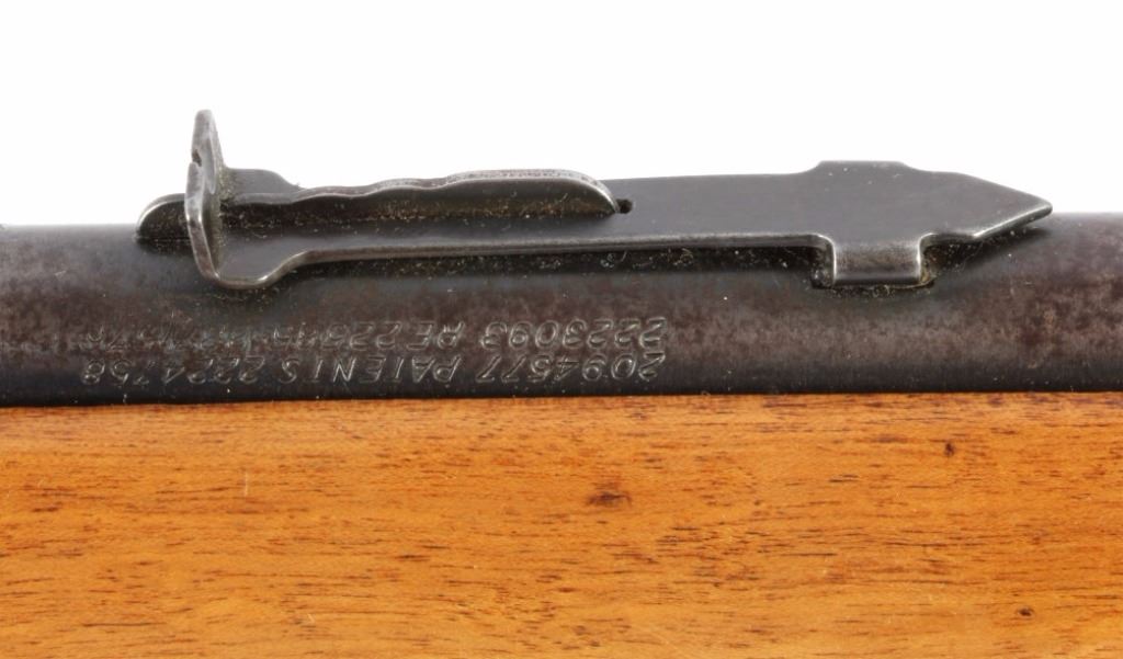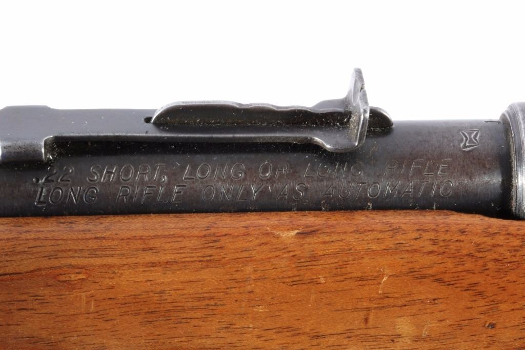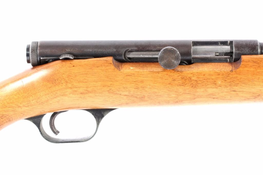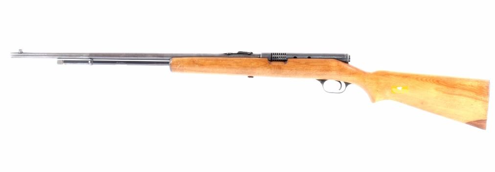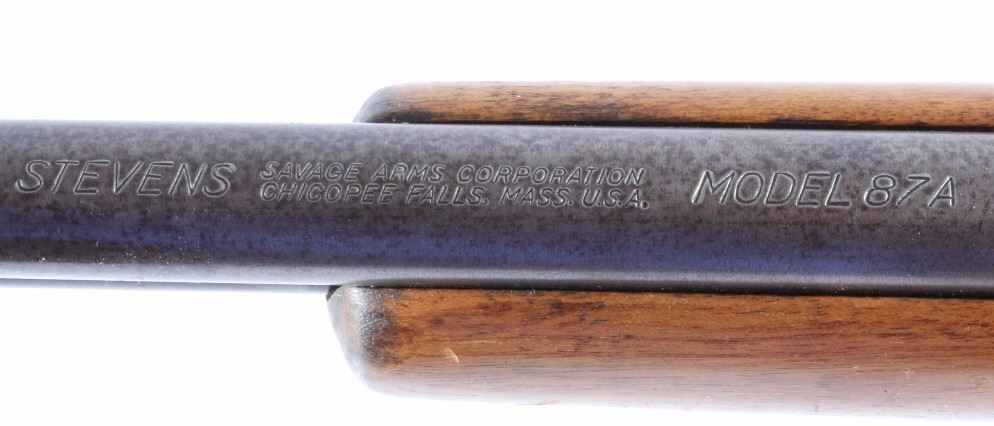 This is a Savage Arms Corp. Stevens Model 87A .22 short, long, and long rifle caliber semi-automatic rifle. The rifle has a solid wood stock with blue finish metal. This model has a unique design with the left side of the receiver vented and the right side having a tab to pull back the bolt. The firearm shows some handling wear, but is a great .22 range rifle. No Serial number as this is a Pre-1964 rifle.