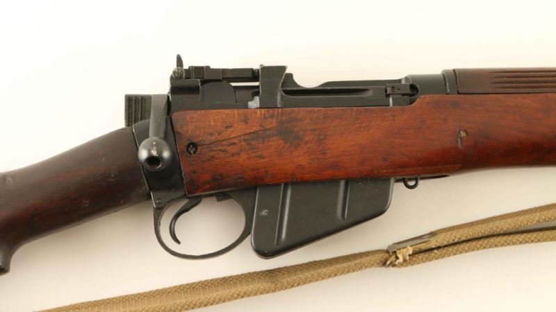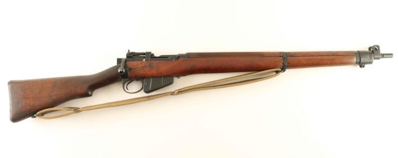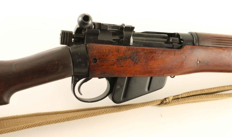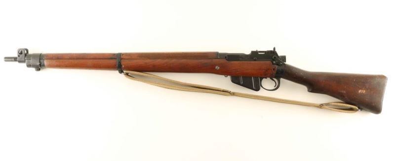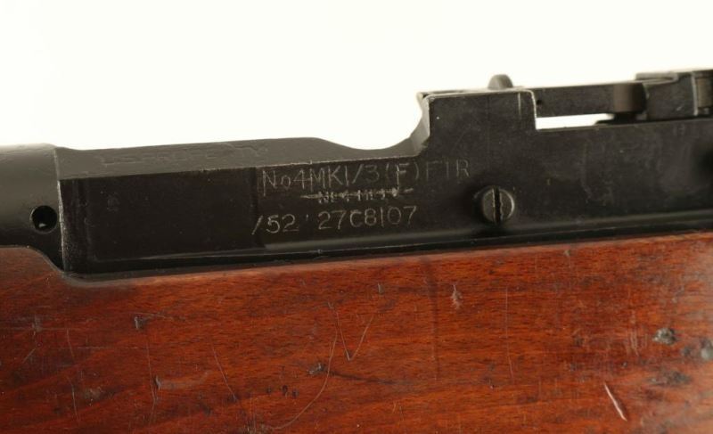 SN: 27C8107 British military magazine fed bolt action service rifle chambered in .303 British, manufactured in the United States circa 1942. Imported into Sacramento, C.A. with an incomplete importer stamp on the top of the barrel. Features a black painted finish, 25.2" barrel with integral bayonet lugs, shrouded patridge front sight, receiver mounted flip-up aperture rear sight graduated to 1,300 yards, two barrel bands, serrated trigger, detachable 10 round magazine, manual safety on the left side of the receiver, hollowed bolt handle, tan canvas sling, integral charge loading guide cuts in the receiver, grooved full-length wood handguard, smooth forend with reinforcement screw, and straight grip shoulder stock with metal trapdoor buttplate. The left side of the receiver is marked "U.S.PROPERTY," "No4.Mk1/3(F)FTR," "No 4 Mk 1*,"(lined out) & "/52. 27C8107." The barrel shows nitro proof marks on the underside. Rifle exhibits approximately 90% of it's black paint finish nearly all of its black paint finish showing light scattered wear. Action is sound, the bore is pristine and the wood stocks are near good with cracks & repairs. Condition is NRA Good+. ***C&R Firearm*** From The John F Sukey Collection