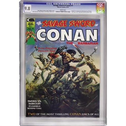 <B>Savage Sword of Conan #1 (Marvel, 1974) CGC NM/MT 9.8 White pages.</B></I> This first issue features the origin and first appearance of Blackmark by Gil Kane and the third appearance of Red Sonja. Boris Vallejo contributed the painted cover and John Buscema, Neal Adams, and Esteban Maroto added interior art. Overstreet 2007 NM- 9.2 value = $150. CGC census 5/07: 40 in 9.8, none higher.<BR><BR><b>Shipping:</b> Comics - Slabbed (certified) (<a target="_blank" href="http://www.heritageauctions.com/common/shipping.php">view shipping information</a>)