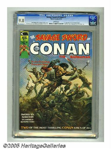 <B>Savage Sword of Conan #1 (Marvel, 1974) CGC NM/MT 9.8 White pages.</B></I> Marvel called upon fantasy artist supreme Boris Vallejo for the inaugural cover of this title. Conan, Red Sonja, and Blackmark stories are featured. John Buscema, Neal Adams, and Esteban Maroto contributed interior artwork. CGC hasn't assigned a higher grade to date for this issue. Overstreet 2005 NM- 9.2 value = $120. CGC census 1/05: 9 in 9.8, none higher.