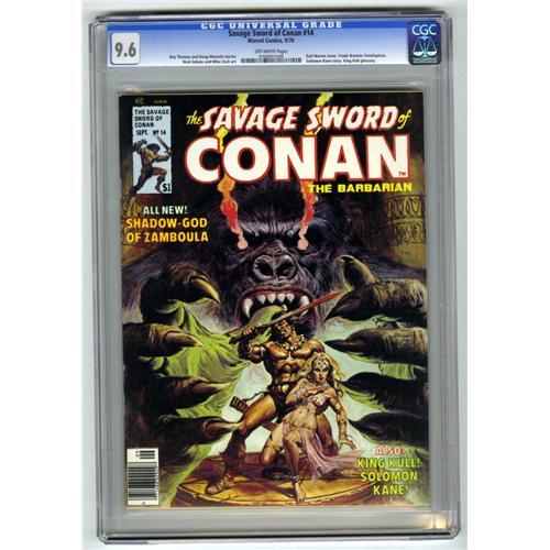 <B>Savage Sword of Conan #14 (Marvel, 1976) CGC NM+ 9.6 Off-white pages.</B></I> Earl Norem cover. Neal Adams, Frank Brunner, and Mike Zeck art. Solomon Kane story. Overstreet 2006 NM- 9.2 value = $16. CGC census 2/07: 3 in 9.6, none higher.<BR><BR><b>Shipping:</b> Comics - Slabbed (certified) (<a target="_blank" href="http://www.heritageauctions.com/common/shipping.php">view shipping information</a>)