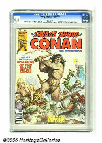 <B>Savage Sword of Conan #16 (Marvel, 1976) CGC NM/MT 9.8 White pages.</B></I> Earl Norem cover. Barry Smith, John Buscema, Alfredo Alcala, Richard Corben, Roy Krenkel, and Gene Day art. Overstreet 2005 NM- 9.2 value = $15. CGC census 1/05: 1 in 9.8, none higher. <I>From the collection of Chris Bell.</B></I>
