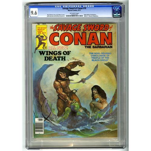 <B>Savage Sword of Conan #19 (Marvel, 1977) CGC NM+ 9.6 Off-white pages.</B></I> Ken Morris cover. John Buscema, Rudy Nebres, and Alfredo Alcala art. Overstreet 2006 NM- 9.2 value = $16. CGC census 2/07: 3 in 9.6, 4 higher.<BR><BR><b>Shipping:</b> Comics - Slabbed (certified) (<a target="_blank" href="http://www.heritageauctions.com/common/shipping.php">view shipping information</a>)