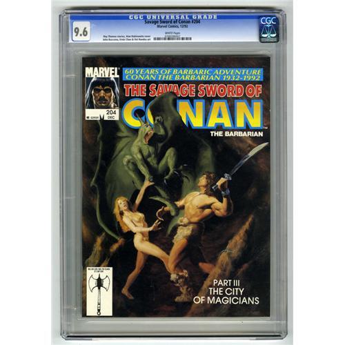 <B>Savage Sword of Conan #204 (Marvel, 1992) CGC NM+ 9.6 White pages.</B></I> Alan Rabinowitz cover. John Buscema, Ernie Chan, and Ovi Hondru Art. Overstreet 2006 NM- 9.2 value = $6. CGC census 2/07: 2 in 9.6, none higher.<BR><BR><b>Shipping:</b> Comics - Slabbed (certified) (<a target="_blank" href="http://www.heritageauctions.com/common/shipping.php">view shipping information</a>)