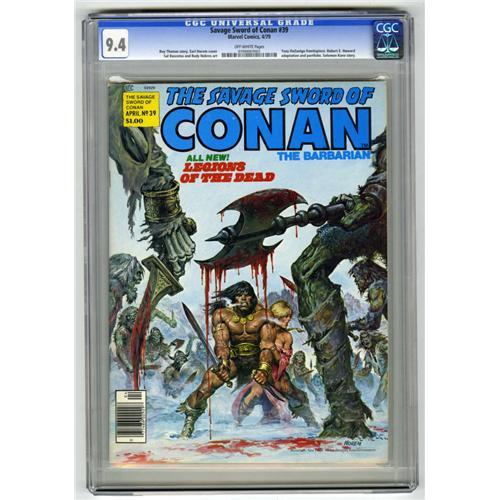 <B>Savage Sword of Conan #39 (Marvel, 1979) CGC NM 9.4 Off-white pages.</B></I> Tony DeZuniga frontispiece. Robert E. Howard adaptation. Solomon Kane story. Earl Norem cover. Sal Buscema and Rudy Nebres art. Overstreet 2006 NM- 9.2 value = $12. CGC census 2/07: 4 in 9.4, 3 higher.<BR><BR><b>Shipping:</b> Comics - Slabbed (certified) (<a target="_blank" href="http://www.heritageauctions.com/common/shipping.php">view shipping information</a>)