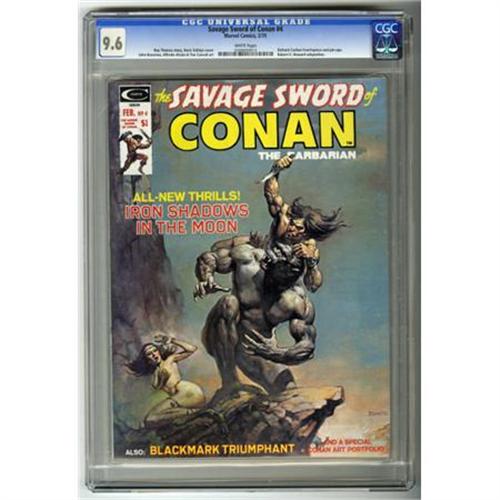<B>Savage Sword of Conan #4 (Marvel, 1975) CGC NM+ 9.6 White pages.</B></I> Neal Adams cover. Adams, Gil Kane, and P. Craig Russell art. Overstreet 2007 NM- 9.2 value = $35. CGC census 10/07: 6 in 9.6, 2 higher.<BR><BR><b>Shipping:</b> Comics - Slabbed (certified) (<a target="_blank" href="http://www.heritageauctions.com/common/shipping.php">view shipping information</a>)