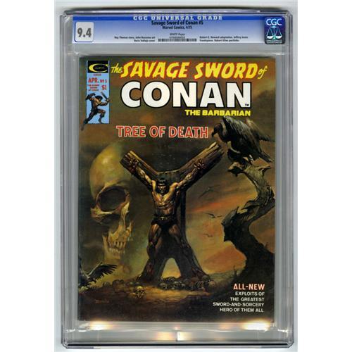 <B>Savage Sword of Conan #5 (Marvel, 1975) CGC NM 9.4 White pages.</B></I> Adaptation of the Robert E. Howard story "A Witch Shall Be Born." Boris Vallejo cover. John Buscema art. Jeff Jones frontispiece. Overstreet 2006 NM- 9.2 value = $25. CGC census 2/07: 6 in 9.4, 21 higher.<BR><BR><b>Shipping:</b> Comics - Slabbed (certified) (<a target="_blank" href="http://www.heritageauctions.com/common/shipping.php">view shipping information</a>)