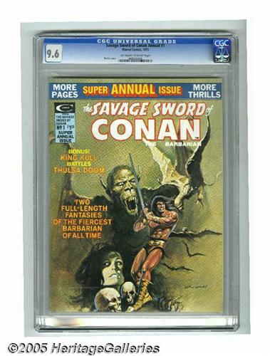 <B>Savage Sword of Conan Annual #1 (Marvel, 1975) CGC NM+ 9.6 Off-white to white pages.</B></I> Enrique Badia Romero cover. Barry Smith art. Overstreet 2005 NM- 9.2 value = $25. CGC census 1/05: 1 in 9.6, 1 higher. <I>From the collection of Chris Bell.</B></I>