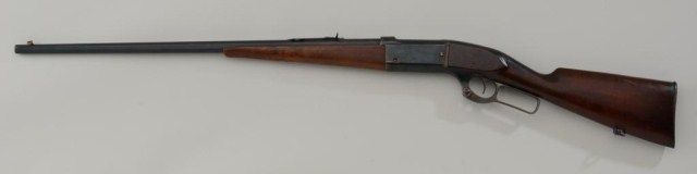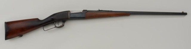 Savage lever action rifle by Marlin, Sav. .303 cal., 26” octagon barrel, re-blued finish, wood stocks, #34882. This gun is in overall good finish as re-finished with a good bore and action, butt stock has beenre-finished also and the fore stock shows several old edge losses and two holes where the forward sling swivel once had been positioned; brass case counter, case hardened lever. Est.: $250-$500.