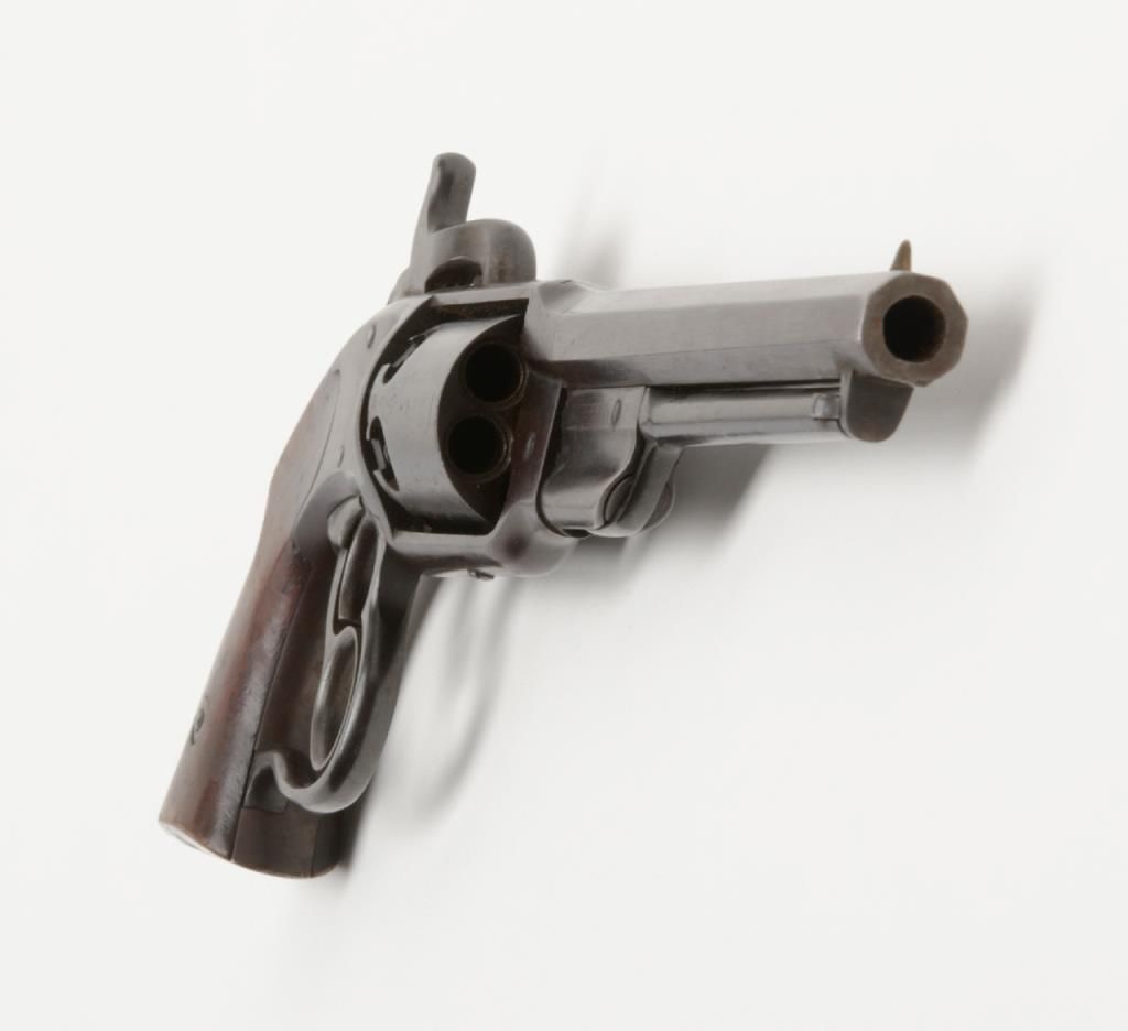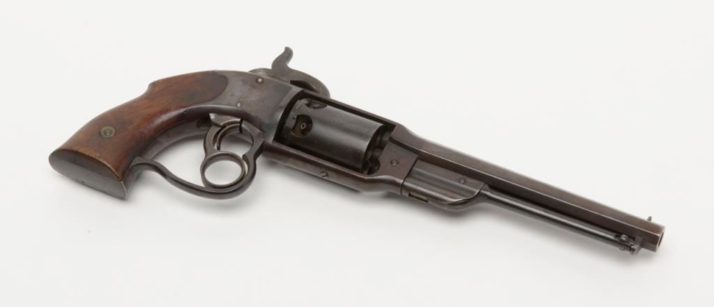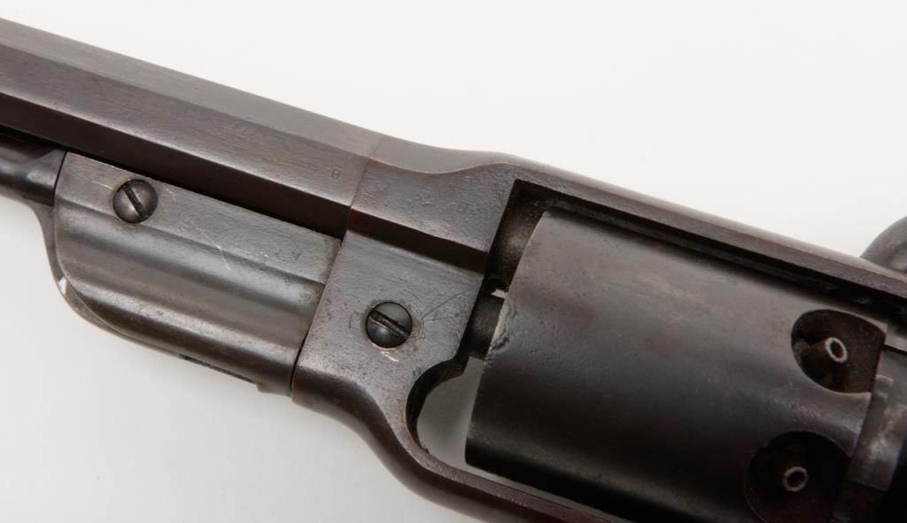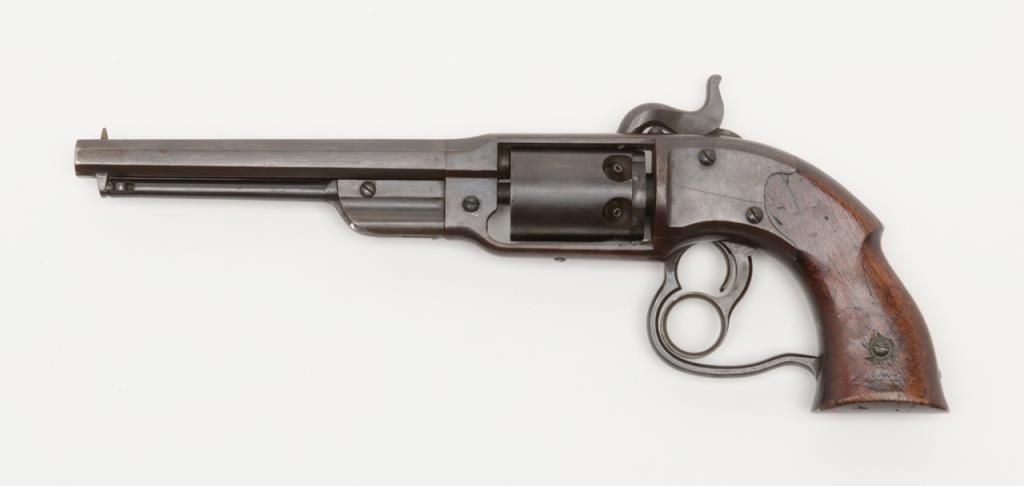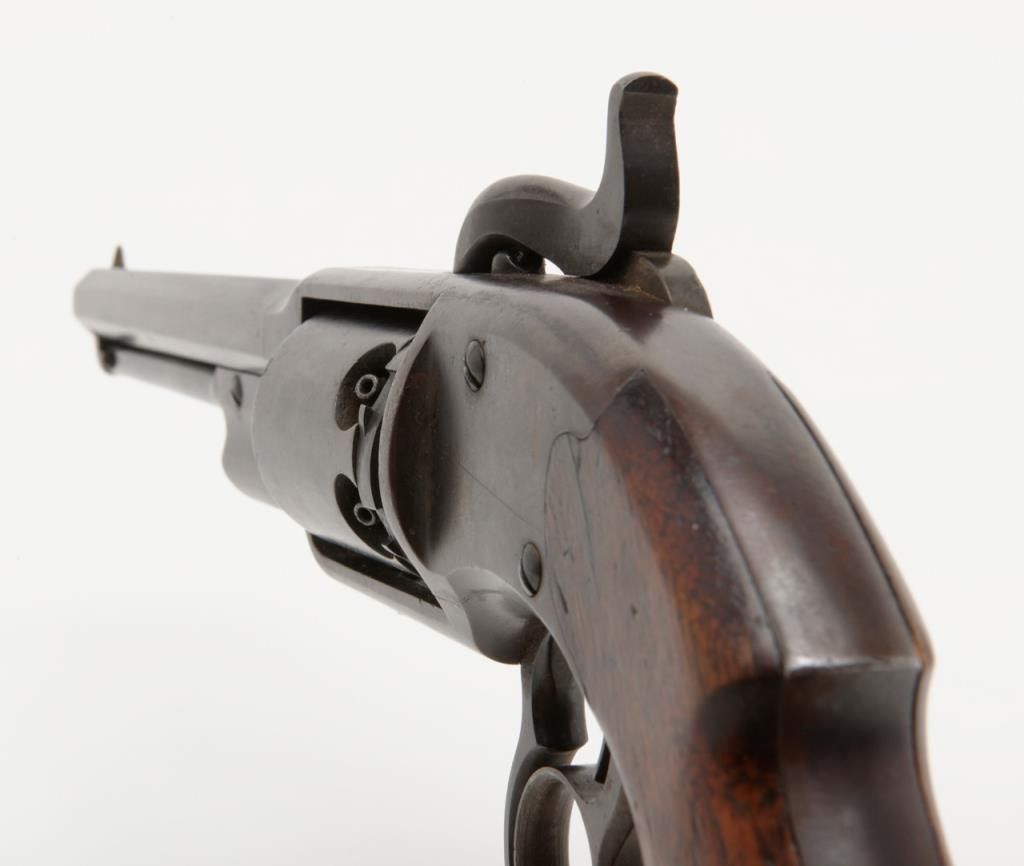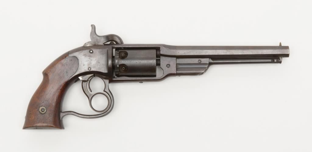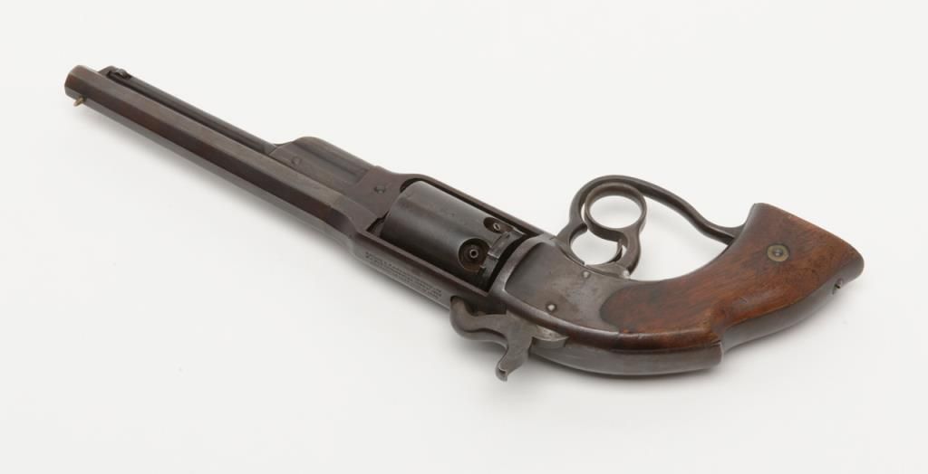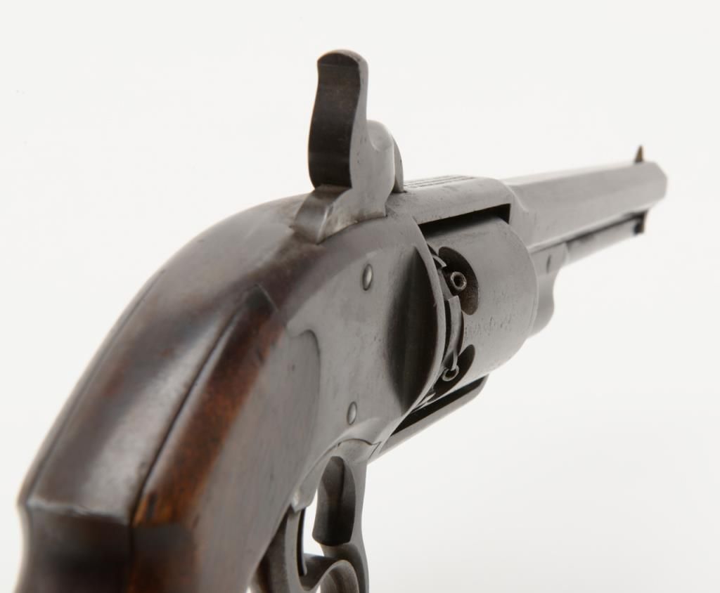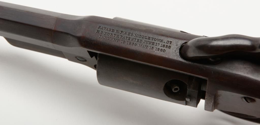 Savage ring trigger, .36 caliber percussion Civil War issue percussion revolver with 6 shot cylinder and 7 1/8” octagon barrel. The pistol shows an “H” inspection and partial cartouche on the left grip, serial number 12692. The metal surfaces show a smooth patina finish with strong traces of blue mixed in perhaps as much as 20% to 40% which is toning and aging. There is some scattered light to moderate pitting and most of the pitting is on the firing areas of the cylinder. The grips aregood to very good with the outline of the cartouche but shows no initials. The address on top of the frame is sharp and crisp and the action works well. There is traces of case hardening on the hammer and the ring. The cone front sight isretained. A considerably better than average Savage. William A. Gary collection consigned by his estate. Est.: $1250-$2500
