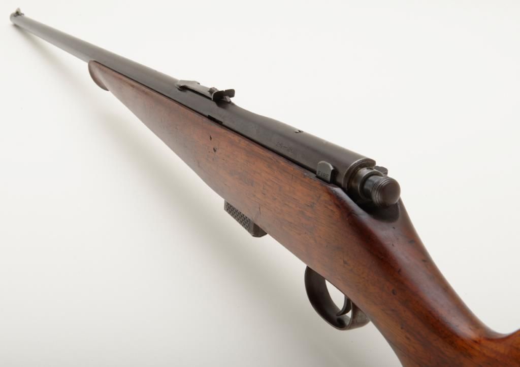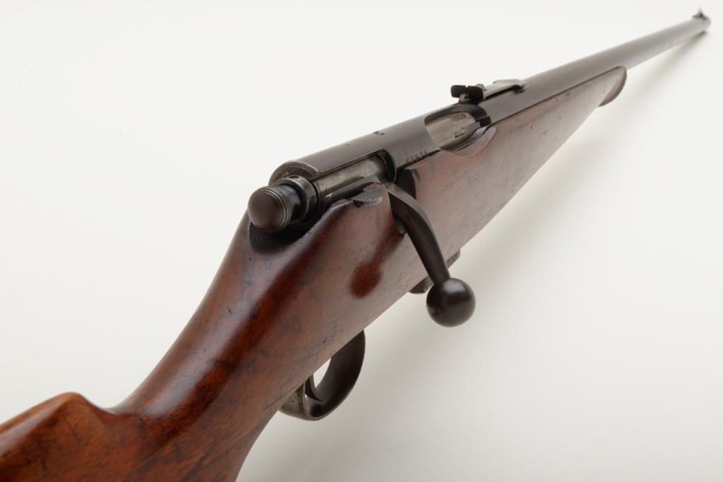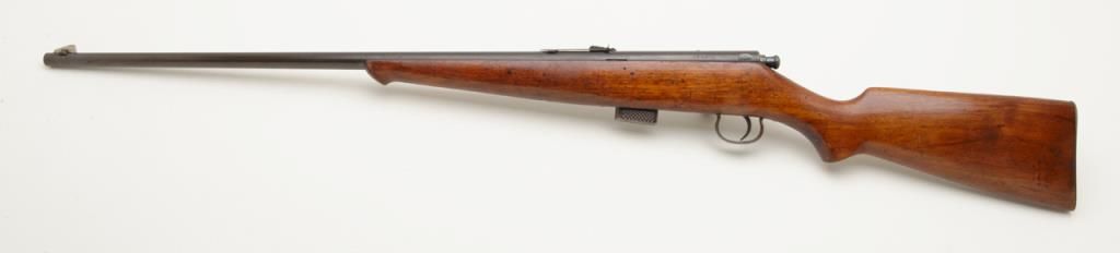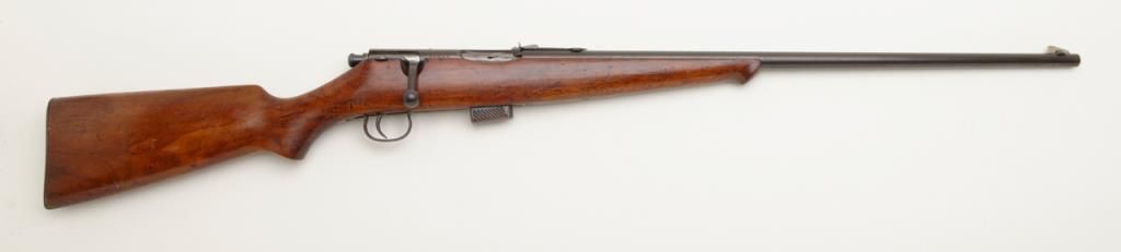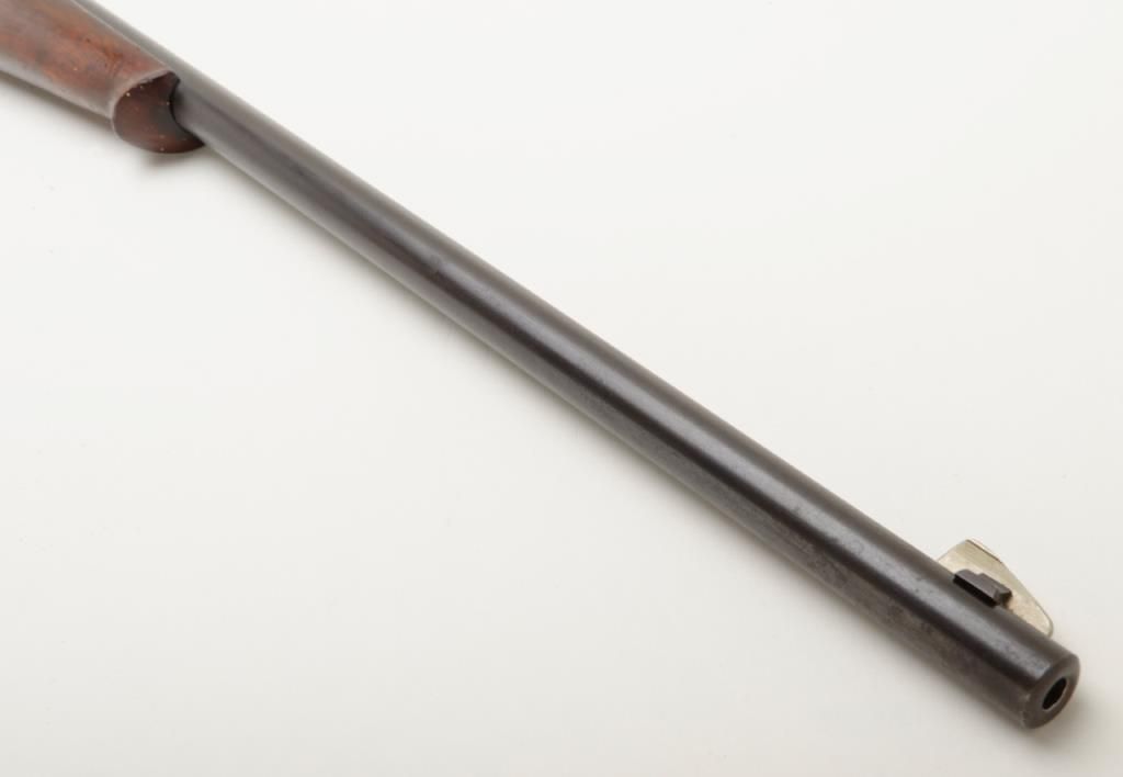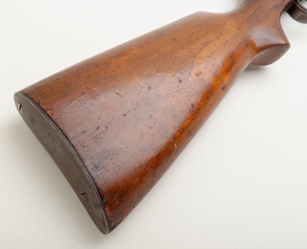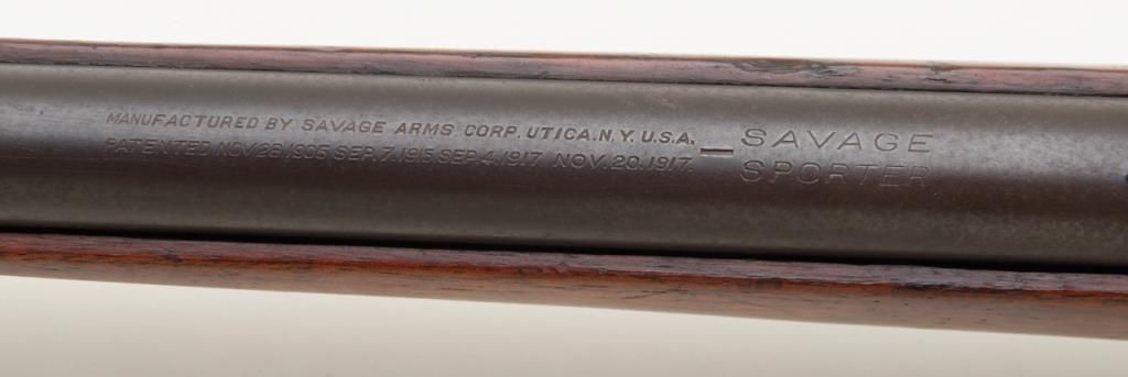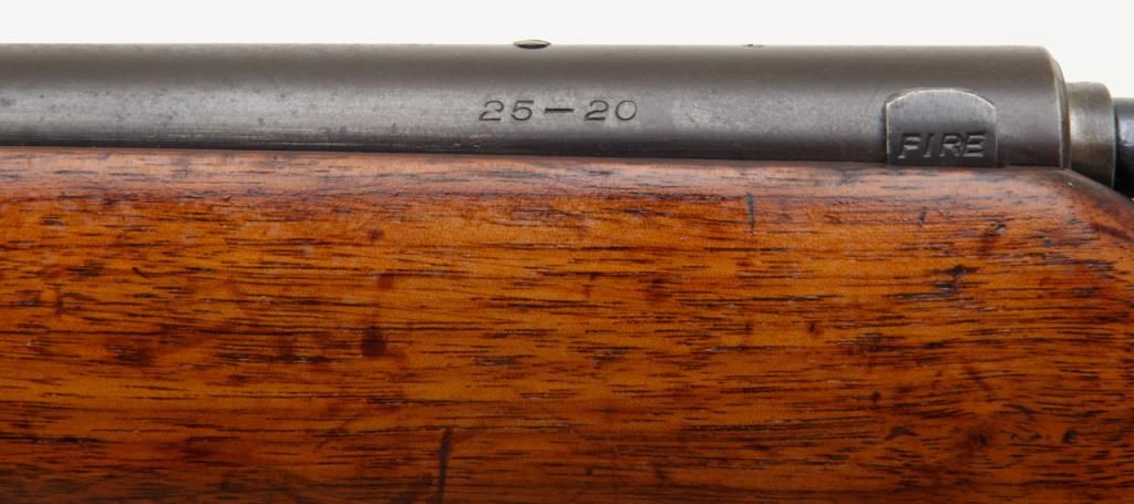 Savage sporter in desirable .25-20 Winchester caliber remaining in good to very good condition, serial number 62923. The rifle shows 50% to 70% original blue turning to a brown patina with some scattered light to moderate erosion and pinprick pitting just starting. The markings are good and the metal is generally good to very good. The stock is also good to very good with some minor blemishes and crazing to the finish, small imperfections and general aging. The original Savage marked butt plate and clip are retained. The bore is bright and at least very good plus to near fine. Est.: $250-$500