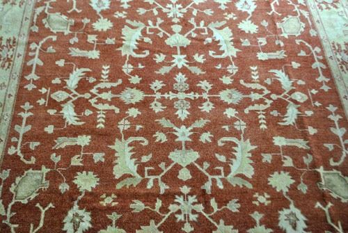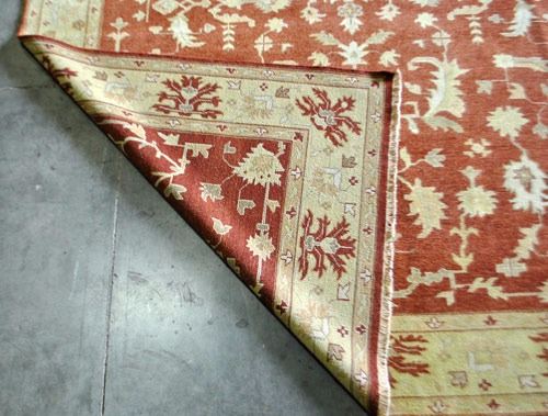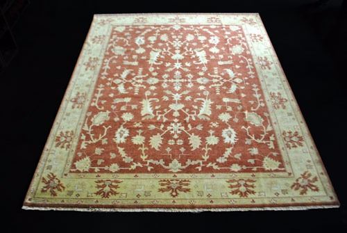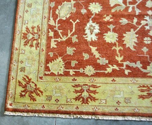 Simply stunning handmade allover floral oushak design Rug. Made of 100% baby lamb's wool pile on cotton foundation, all natural vegetable dye, beautiful detailed allover floral pattern on a burgundy background, contrasted beautifully with a mustard yellow floral trim. nicely contrasted hand woven Rug with the colors complementing each other beautifully. Size: 8 feet X 9 feet 11 inches.