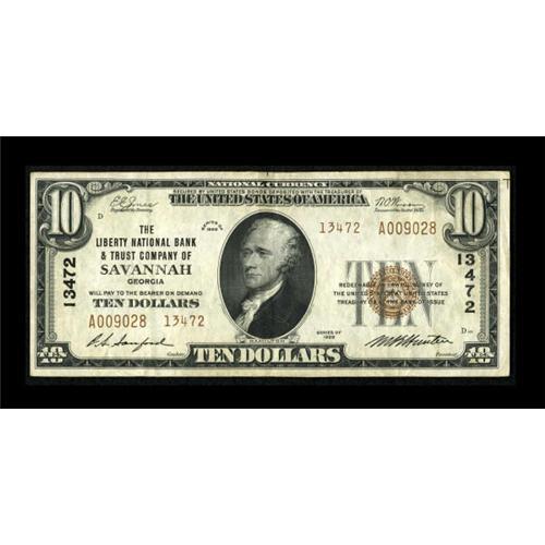 <B>Savannah, GA</B></I> - $10 1929 Ty. 2 <B>The Liberty NB & TC</B></I> Ch. # 13472<BR> A look at the census reveals about a dozen examples of this note are known to the collecting community. However, the number of pieces that have reached public auction has only now reached four, with the last appearance in 2004. This addition to the census is a fresh <B>Very Fine- Extremely Fine </B></I>with appealing and wholly original paper.<BR><BR><b>Shipping:</b> Coins & Currency (<a target="_blank" href="http://www.heritageauctions.com/common/shipping.php">view shipping information</a>)