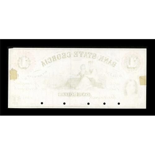 <B>Savannah, GA- Bank of the State of Georgia</B></I> $1 UNL Proof<BR> An attractively vignetted Proof which is very scarce and did not come from the American Bank Note Company archives sale. <B>Uncirculated</B></I> with 5 POC, with a pair of hinges on the reverse and a small chip off the top right corner which does not affect the design. The red overprint is as bright as the day it was affixed. <BR><I>From The Collection of a Louisiana Gentleman.</B></I><BR><BR><b>Shipping:</b> Coins & Currency (<a target="_blank" href="http://www.heritageauctions.com/common/shipping.php">view shipping information</a>)