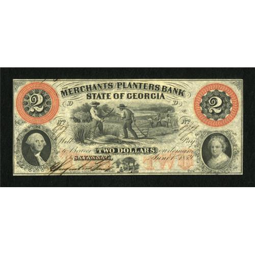 <B>Savannah, GA- Merchants and Planters Bank </B></I>$2 June 1, 1859 G4c<BR> An attractive, fully issued note with bold signatures. When we last sold this piece we called it <B>Choice Crisp Uncirculated, </B></I>which we still fully believe. There is a corner tip bump however, that would likely be looked down upon by a third party grading service.<BR><I>From The Collection of a Louisiana Gentleman</B></I><BR><BR><b>Shipping:</b> Coins & Currency (<a target="_blank" href="http://www.heritageauctions.com/common/shipping.php">view shipping information</a>)
