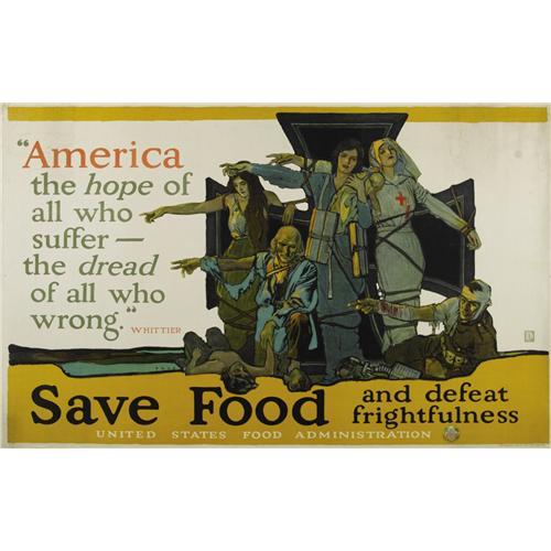 <B>Save Food and Defeat Frightfulness.</B></I> 54" x 36". Artist: M. Paus. This is a unique opportunity to obtain an example of this scarce poster. Paus was a popular magazine cover artist who did over 50 covers for <I>Popular Science Monthly</B></I> and <I>Colliers.</B></I> This poster features a quote by the famous Quaker poet John Greenleaf Whittier. Whittier was a leading voice in the anti-slavery movement and at times was even attacked for his views. His quote featured here is an impressive homage to Whittier's impressions on America's role as a haven for the oppressed and how people should be treated. <BR><BR>Condition: Fine - soiling visible in the corners; linen backed.