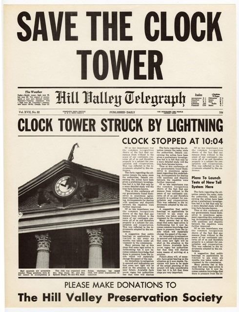 A ‘Save the Clock Tower’ flyer from Robert Zemeckis' time travel adventure Back to the Future. The Hill Valley Preservation Society handed out these flyers to Marty McFly (Michael J. Fox) and Jennifer (Claudia Wells). This printed black and white flyer features the header "Save the Clock Tower" and a photocopy of a Hill Valley Telegraph newspaper article headlined "Clock Tower Struck by Lightning," written in the wake of the events McFly witnessed in 1955. It is in excellent overall condition with minimal signs of wear from production and age. Dimensions: 11" x 8.5" (28 cm x 21.5 cm). Comes with a Certificate of Authenticity from Studio Auctions.