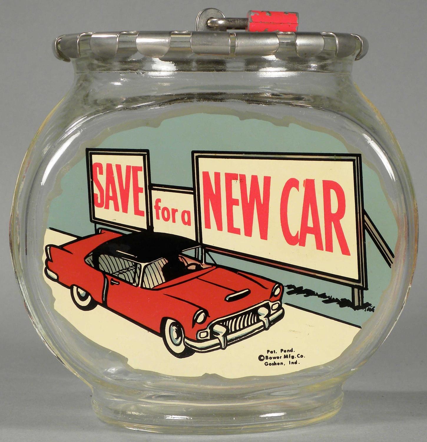 "Save for a New Car" Glass Fish Bowl Bank with locking lid. Bower Mfg. Goshen, Ind. No chips or cracks, comes with lock and key. Near mint condition. 5 X 5 X 3 1/2 inches. Start Price $50
