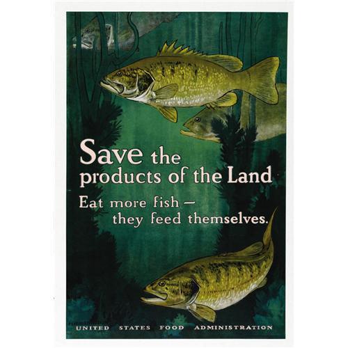 <B>Save the Products of the Land.</B></I> 30" x 20" Artist: Charles Livingston Bull. This poster is very scarce and much in demand. Printed for the United States Food Administration. Charles Livingston Bull was a member of the New York Water Club, and specialized in drawing birds and animals. This conservation poster encouraged Americans to eat more fish, rather than farm animals, since fish support and feed themselves, whereas farm animals had to be fed and maintained with precious resources needed for the war. A scarce and popular poster. <BR><BR>Condition: Extra Fine-no visible flaws or tears; linen backed.