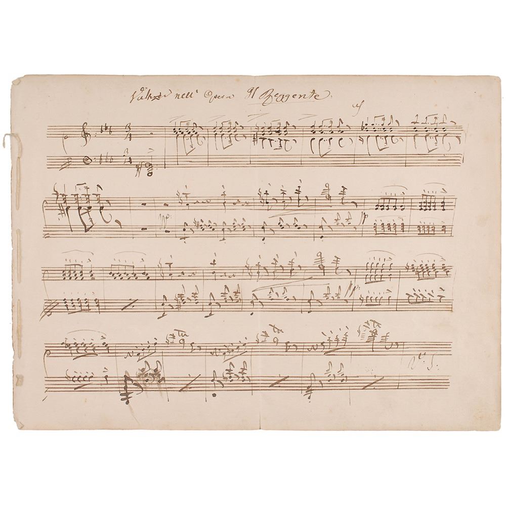 Autograph musical manuscript by Saverio Mercadante, 13.25 x 9.75, two pages both sides, signed and inscribed at the conclusion in Italian and dated 1843. Mercadante pens a lengthy excerpt from his three-act opera "Il Reggente," writing the title at the top. In fine condition, with a central vertical fold. Accompanied by a full letter of authenticity from PSA/DNA.