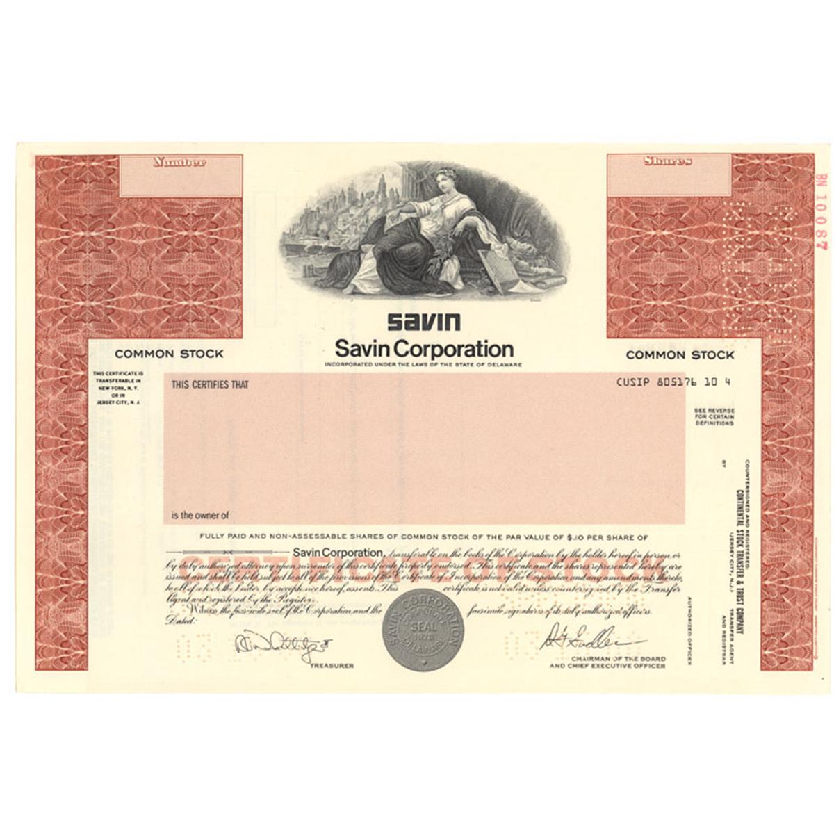 [SPECIMEN] ----, Delaware. Stock certificate specimen in Savin Corporation. Brown / Black. Vignette of allegorical female at top center. Perforation cancellation. Very Fine.