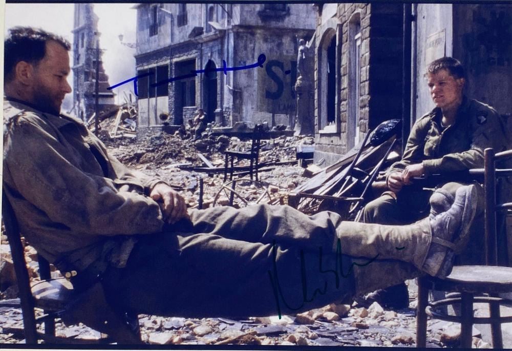 Saving Private Ryan facsimile signed movie photo autographed by Matt Damon and Tom Hanks. 8x10 inches. This item is a reprint of an original autograph