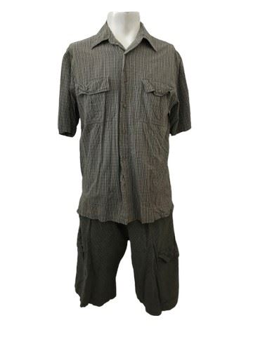 Saving Silverman - J.D.'s (Jack Black) screen worn, "Arnold Palmer", small plaid, beige, brown and blue collared, short sleeve shirt, size 15-15 1/2 and a pair of small plaid, green gray and white checkered cargo shorts with a drawstring, size XL. #1 is written on the inside label.