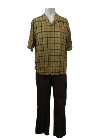 Saving Silverman (2001) - Wayne's (Steve Zahn) screen worn, yellow/black plaid, button-down, short sleeve shirt made by Premium Originals by Red Sand (size large) and a pair of brown work pants made by Ace. Size 34. Includes original costume department wardrobe tag.