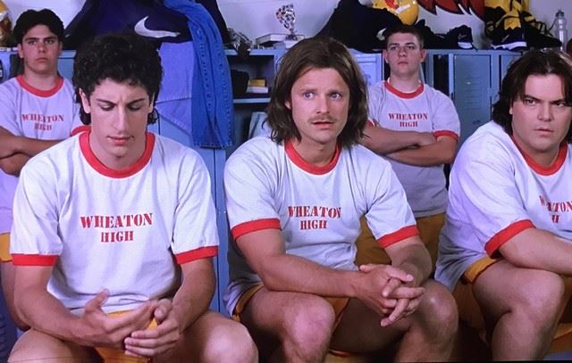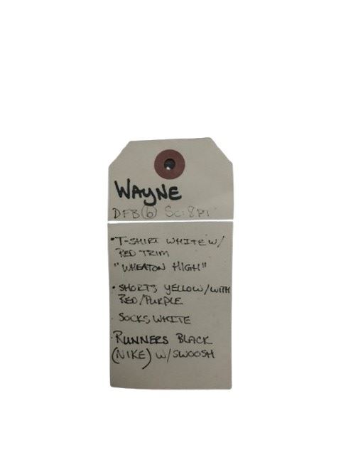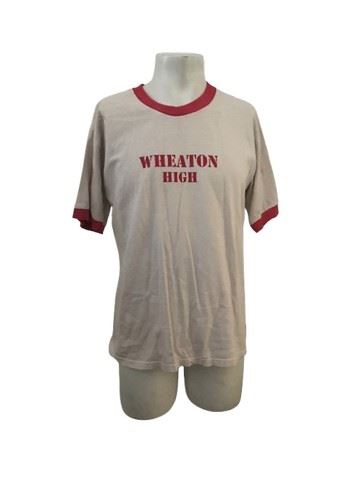 Saving Silverman (2001) - Wayne's (Steve Zahn) screen worn, Wheaton High white with red trim ringer T-shirt. Includes studio costume wardrobe tag. Size m.