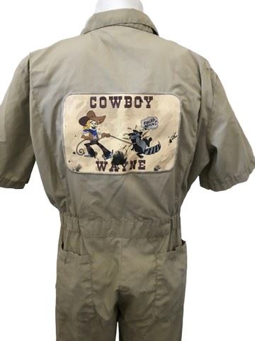 Saving Silverman - Wayne's (Steve Zahn) screen worn Cowboy Wayne khaki colored, short sleeve, company Dickey's coveralls, with his name on a patch sewn on the front left pocket and a custom designed logo patch sewn onto the back. Size 42.