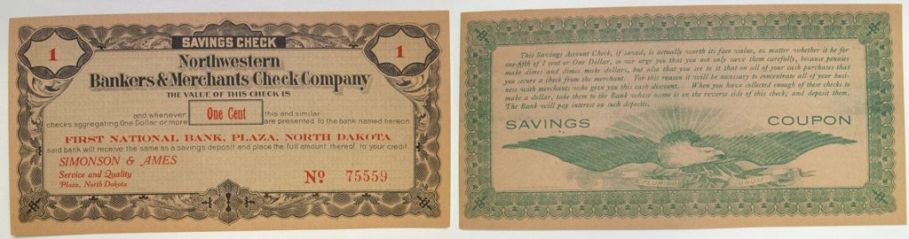 Bankers & Merchants Check Company check for 1 cent to First National Bank