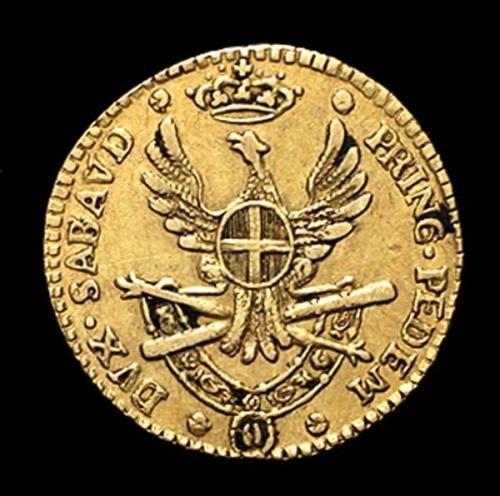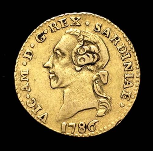 Ducato di Savoia - Vittorio Amedeo III Re di Sardegna (1773-1796) - Quarto di Doppia nuova 1786 - Zecca: Torino - Diritto: effigie del Re a sinistra - Rovescio: aquila coronata ad ali spiegate con stemma sabaudo in petto sopra un trofeo d'armi - gr. 2,26 -