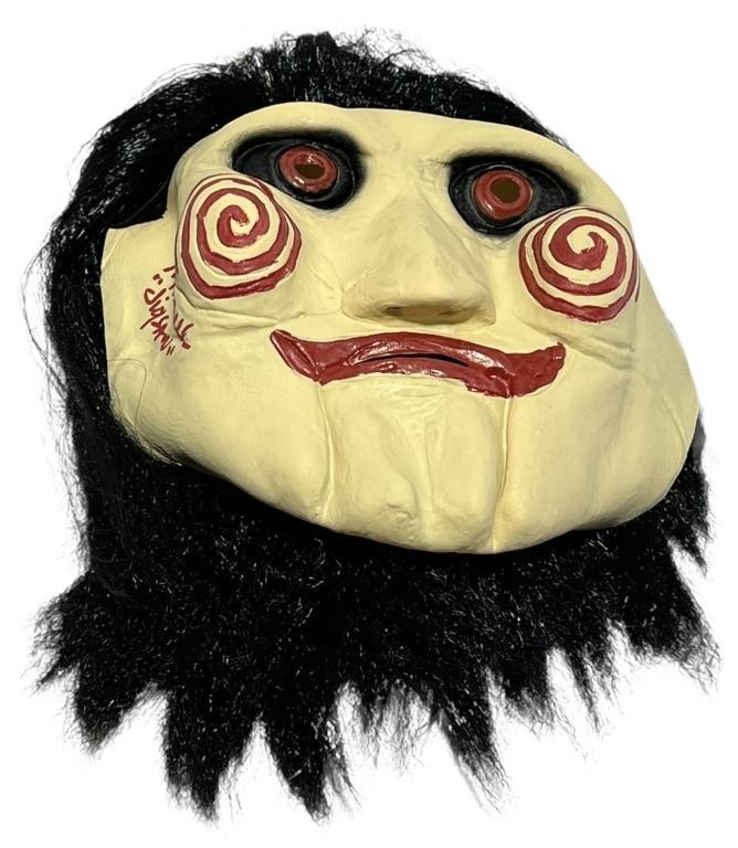 Mask signed by Tobin Bell (Jigsaw) from the horror franchise created by Australian film makers James Wan and Leigh Whannell. It consists of nine feature films and additional media. The first eight films primarily revolve around the fictional serial killer John Kramer, also called the "Jigsaw Killer" or simply "Jigsaw". He was introduced briefly in Saw and developed in more detail in Saw II and the subsequent films.