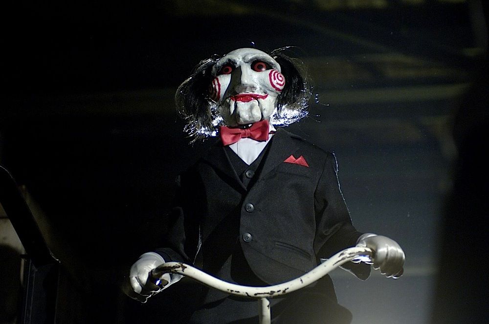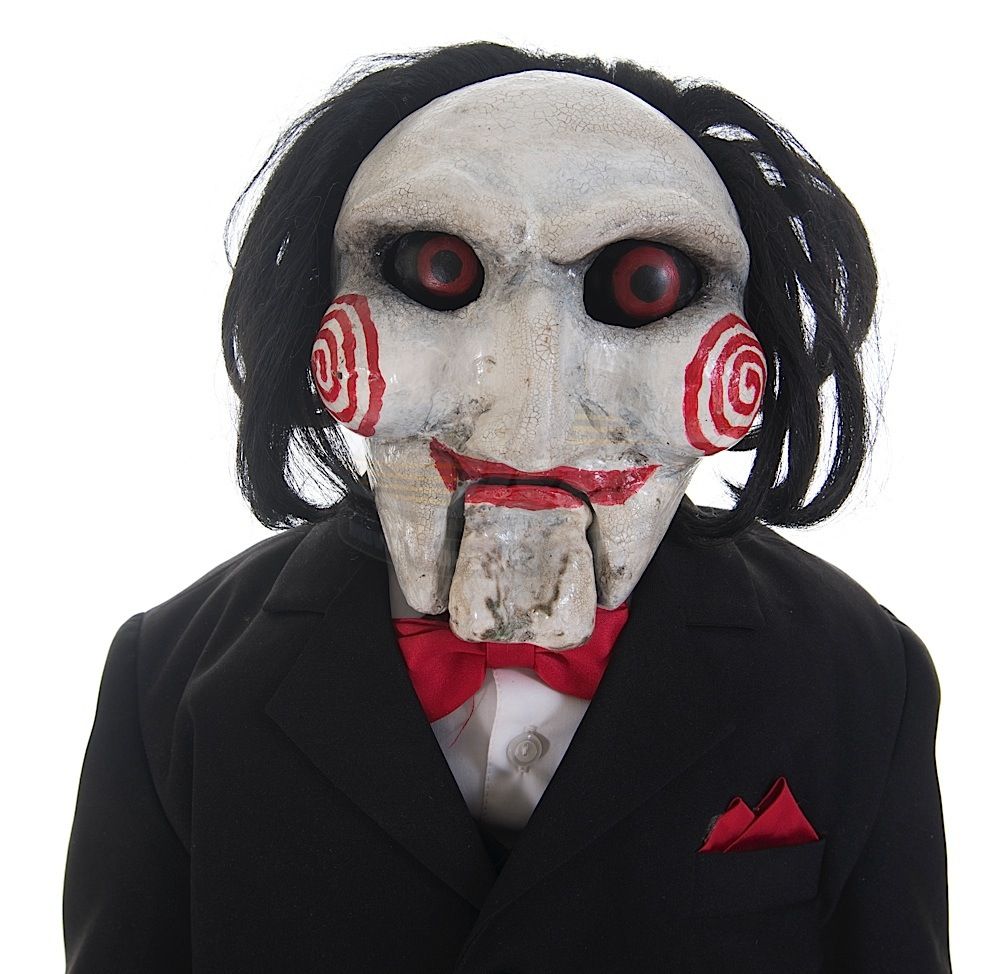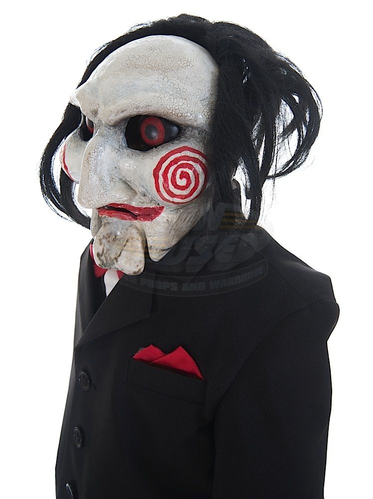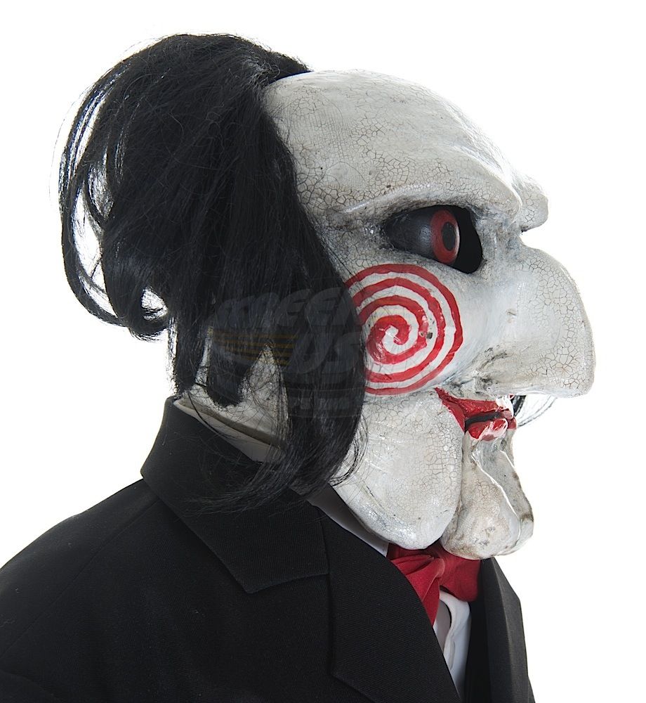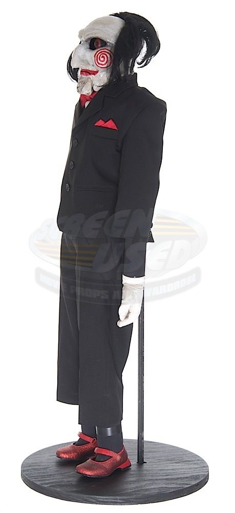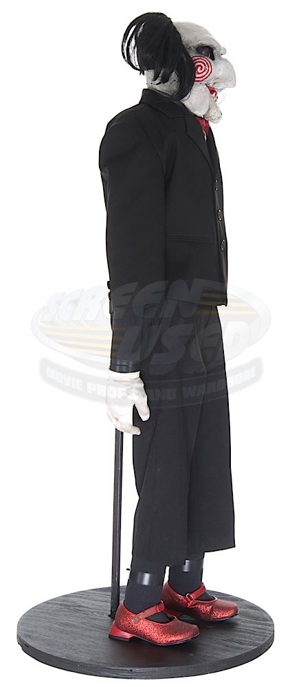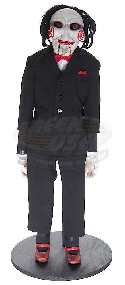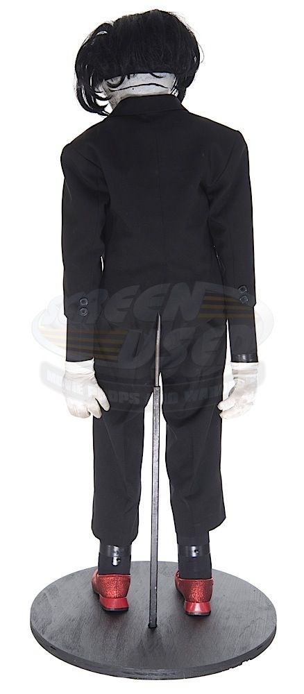 (Twisted Pictures, 2005) This Billy puppet was custom-made by the production for use during filming. The puppet is constructed of a fiberglass and composite body and head with jointed arms and legs. Wires that powered the eyes and mouth are still present and concealed within the puppet. The puppet is dressed in the iconic black tuxedo, white gloves and red shoes. This is the "hero" working puppet, but is untested. Wear from use is present, but remains in very good condition, with several unique marks on the face that match exactly on screen. Measures 24" tall x 15" wide. Along with our ScreenUsed COA, this piece comes with it's original Twisted Pictures studio COA.