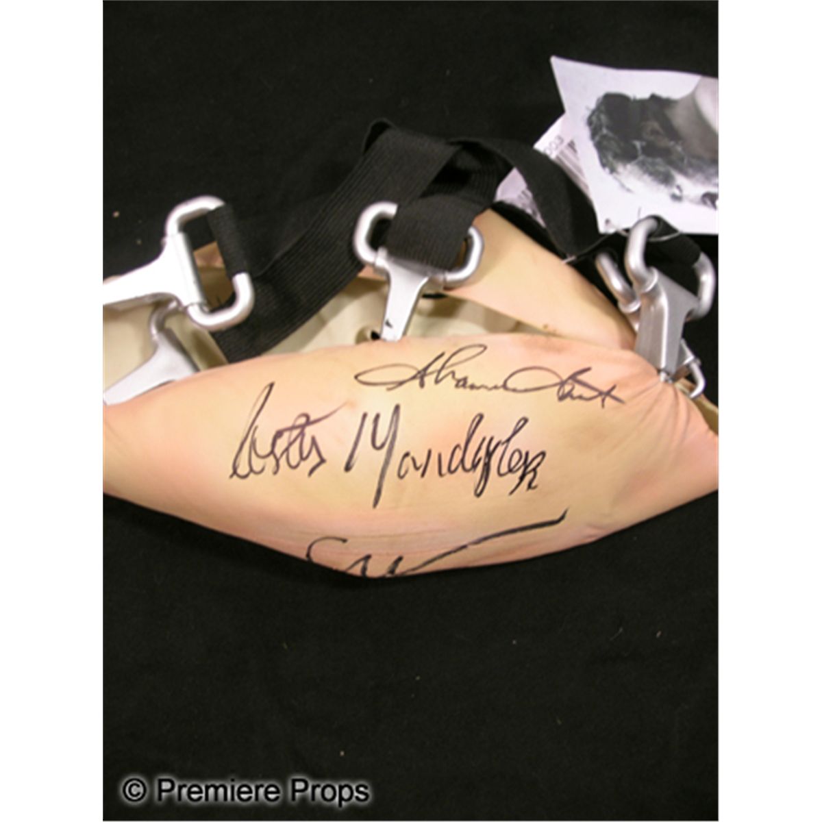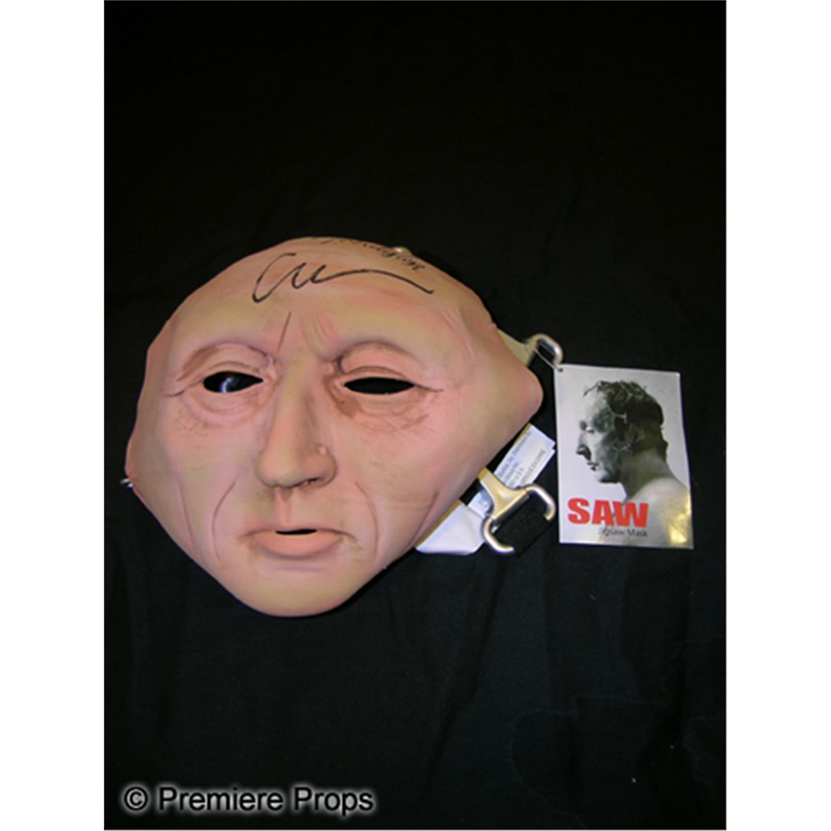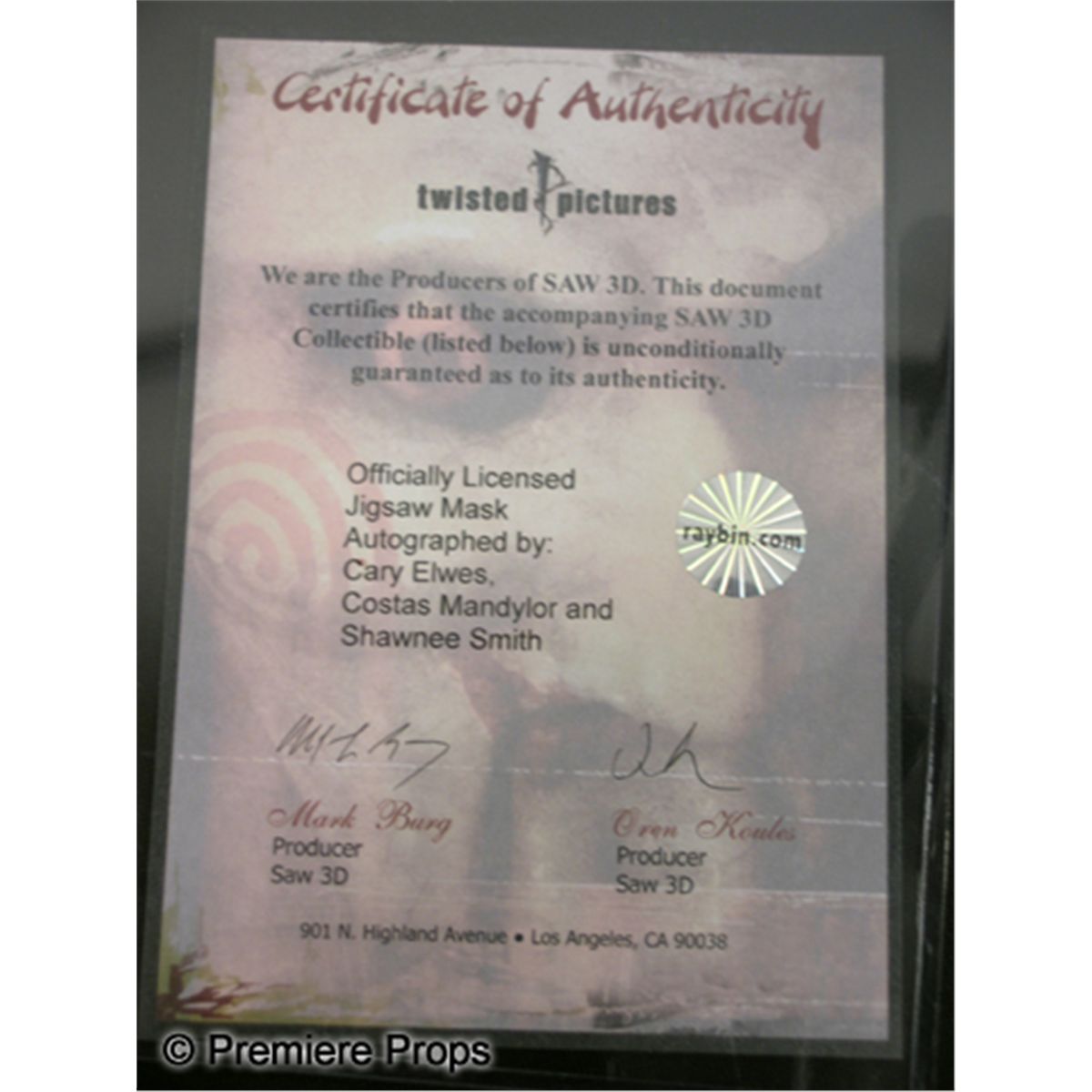 Officially licensed mask of Jigsaw, the homicidal highlight of the Saw franchise, autographed on the forehead by actors Cary Elwes, Costas Mandylor and Shawnee Smith. Includes original tags. This item includes its original certificate of authenticity from Twisted Pictures, listing the notables who signed the mask.