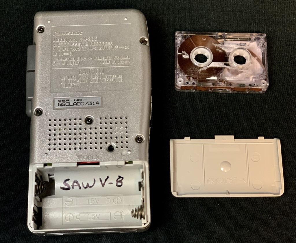 Original cassette player and tape used in the horror film "Saw V" (2008), directed by David Hackl and written by Patrick Melton and Marcus Dunstan and stars Tobin Bell, Costas Mandylor, Scott Patterson, Betsy Russell, Mark Rolston, Julie Benz, Carlo Rota, and Meagan Good. The film focuses primarily on the events that led up to Detective Mark Hoffman becoming an apprentice of the Jigsaw Killer, as well as his efforts to prevent anyone else from learning his secret.