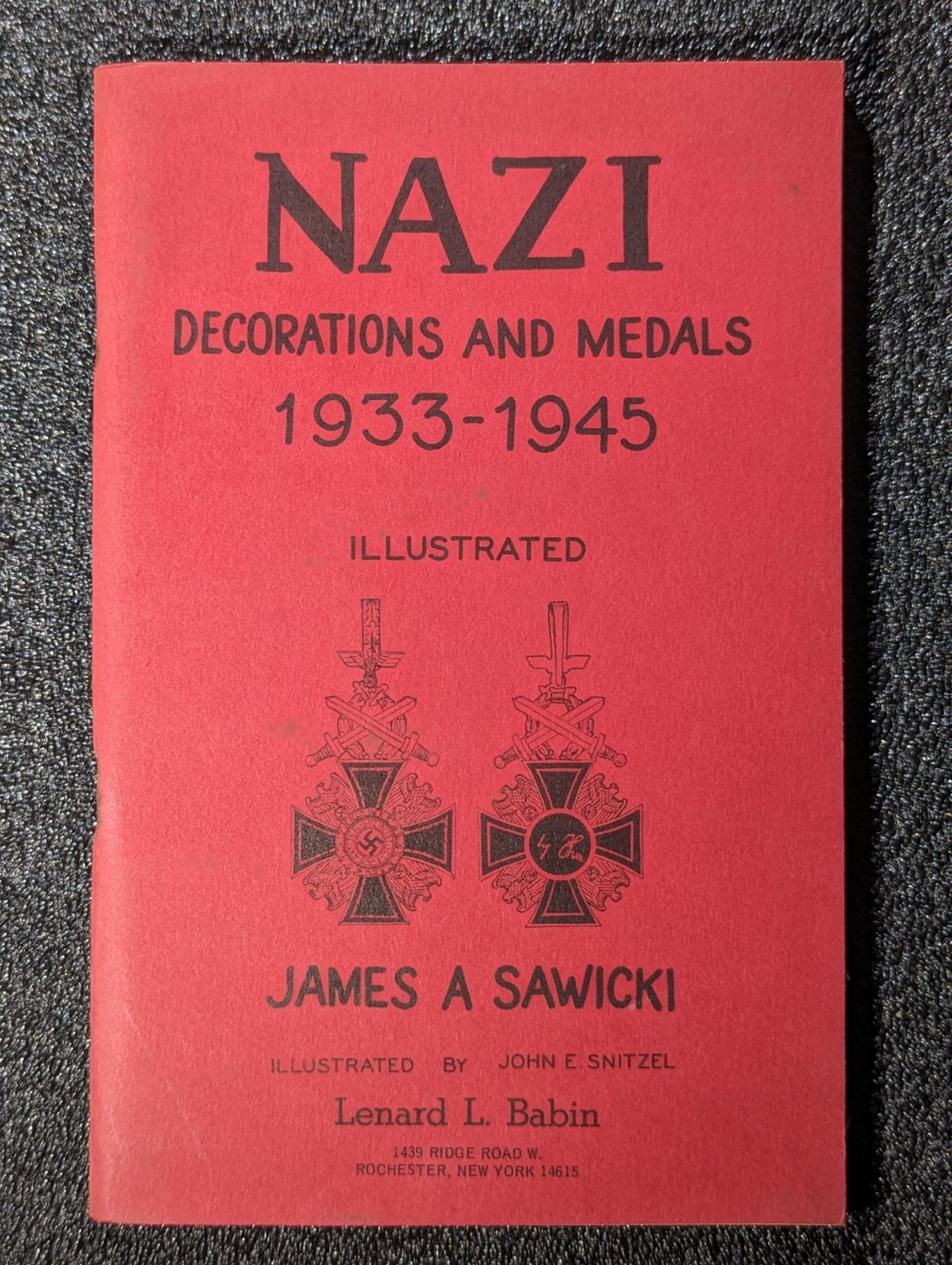 Sawicki, James A. NAZI DECORATIONS AND MEDALS 1933-1945. Leonard L. Babin, Rochester. 1958. 12mo. (8), 75, (5) pages. Original red printed card covers. Line illustrations throughout. Fine. Lot weight: 0 lbs 5oz. Subject(s): German Medals and Decorations.