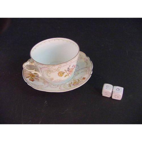 Shell motif, painted floral theme, hand painted, marked Saxe Germany, excellent condition, ca. 1900-1910 era. Very thin china.