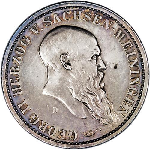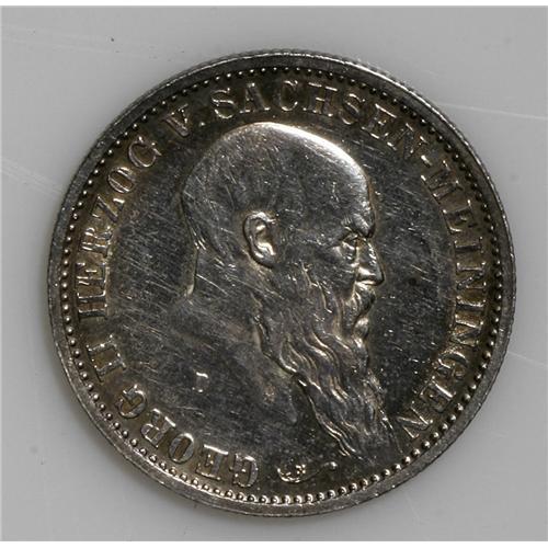 <B>Saxe-Meiningen. Georg II 2 Mark 1901-D, </B></I>KM196, AU, prooflike surfaces, noticeable contact marks in the obverse fields. A very scarce one-year type.