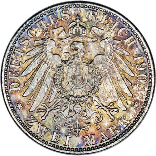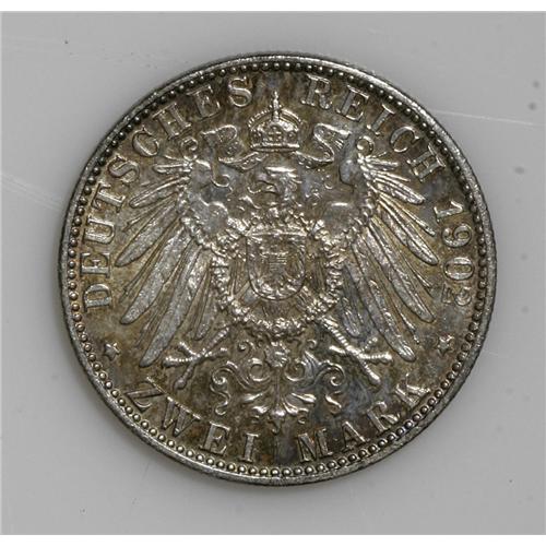 <B>Saxe-Meiningen. Georg II 2 Mark 1902-D Short Beard, </B></I>KM199, choice toned AU-UNC, rare in this superior quality.