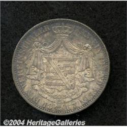 <B>Saxe-Meiningen. Taler 1867,</B></I> KM175 toned XF. <BR><BR><B>Important notice:</B> Heritage usually auctions material at the rate of 200-250 lots per hour. On some occasions eBay Live bid software or the Internet may not be able to keep up with the pace of the auction. We recommend placing a realistic absentee bid now as insurance to avoid disappointment. Occasionally the auctioneer may eliminate or reject an eBay Live bid, and the auctioneer may also reopen a lot after the close of the eBay live bidding (usually because we missed an audience bid), and may reject your bid even if it shows you as the winning bidder. By bidding via eBay Live, you agree that Heritage may award the lot to another bidder at its sole discretion under the circumstances described above or any other reasonable circumstances. Since eBay bids are not shown to us until we open the lot on the floor, we treat those bids just like floor bids. In most cases the floor responds before the eBay bid is presented to us, due to Internet lag time, so for consistency we have made it a policy that floor bids are always considered first over tie eBay live bids. Also please note that all Heritage lots purchased through eBay Live carry a 20% Buyer's Premium. Please make sure you read the Terms and Conditions before you bid.