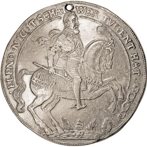 <B>Saxe-Old Gotha. Johan Casimir Broad 2 Taler 1627-WA, </B></I>Davenport LS417, Obv: Duke on horseback; Rev: Helmeted arms. Sharp AU with meticulously sharp features, the fields have been lightly tooled, the flan gilt and holed at the top. Despite the obvious defects this is an attractive example of seventeenth century German numismatic art.