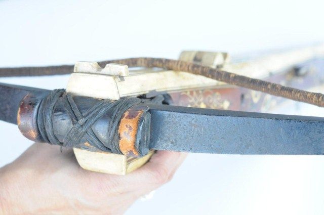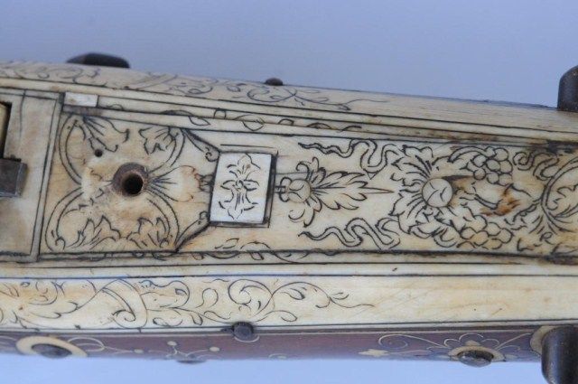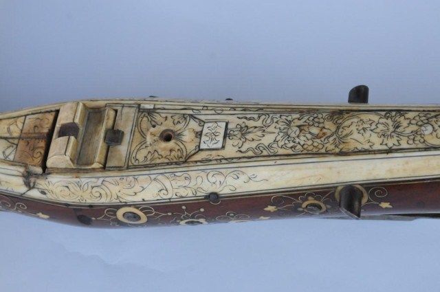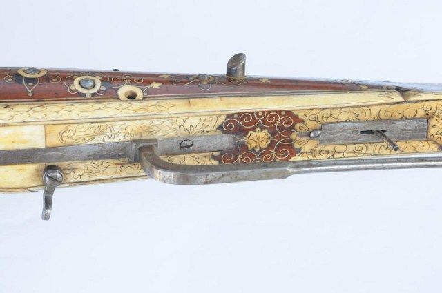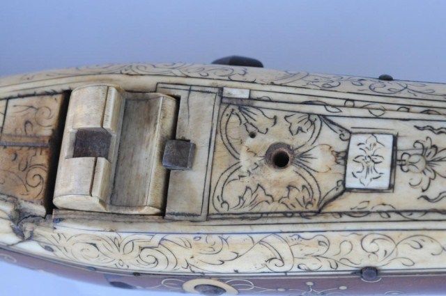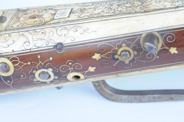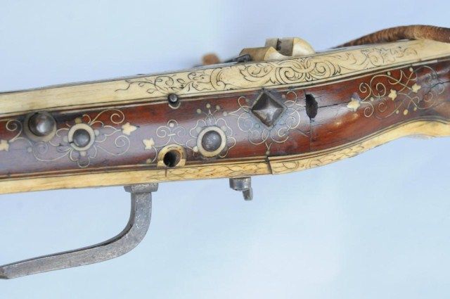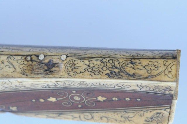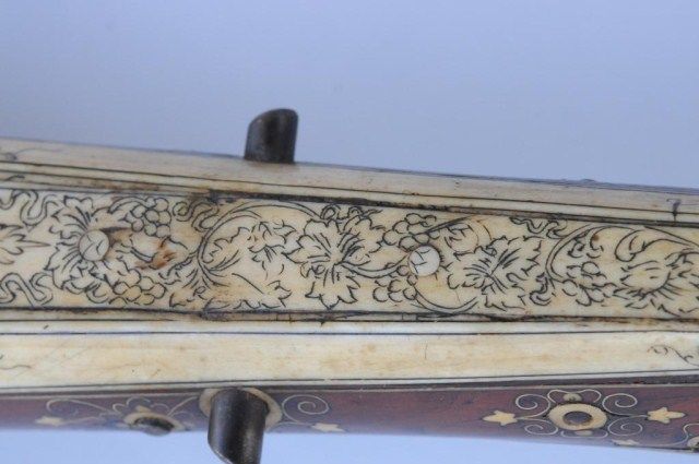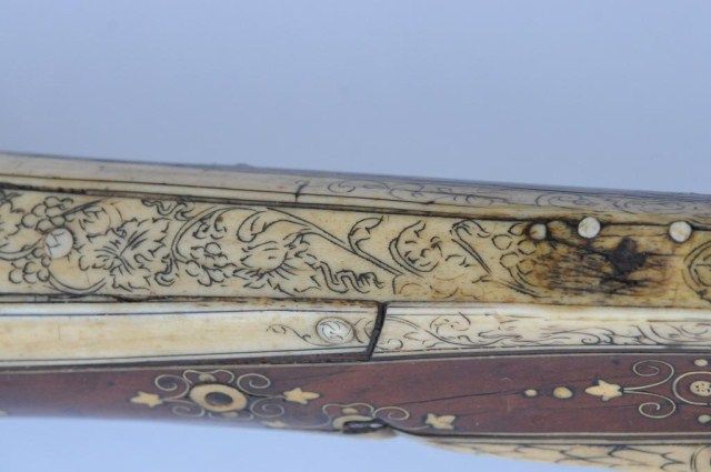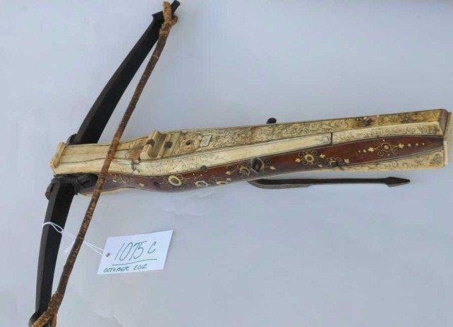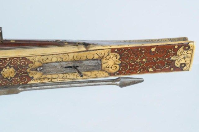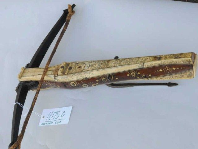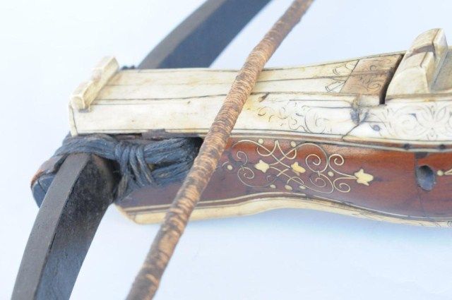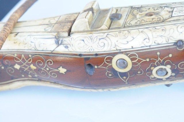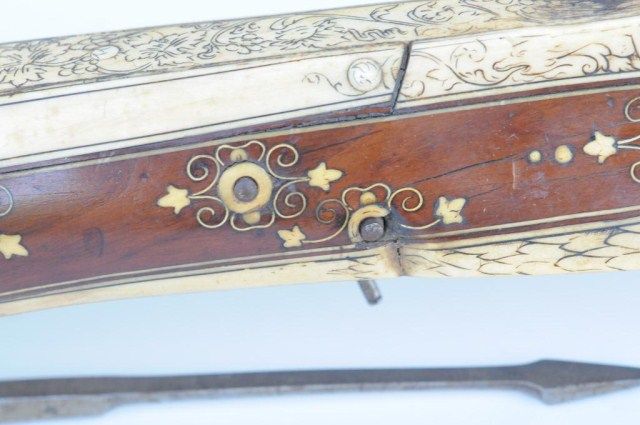 Saxon crossbow with carved bone inlay circa 1580-1650. The iron bow measures 21 1/2" across and retains a period cord. The condition is very good with only normal aging, slight cracks and some wear at topfrom "goat's foot" or "cranikin" being used. The butt cap has a loss of bone and a couple other small chips also. The inlays show tip floral carving with grapes and serpent miked in. A nice size and genuine early crossbowwhich is inlaid similarly to wheelocks of the same era. Est.:$7,500-$15,000.